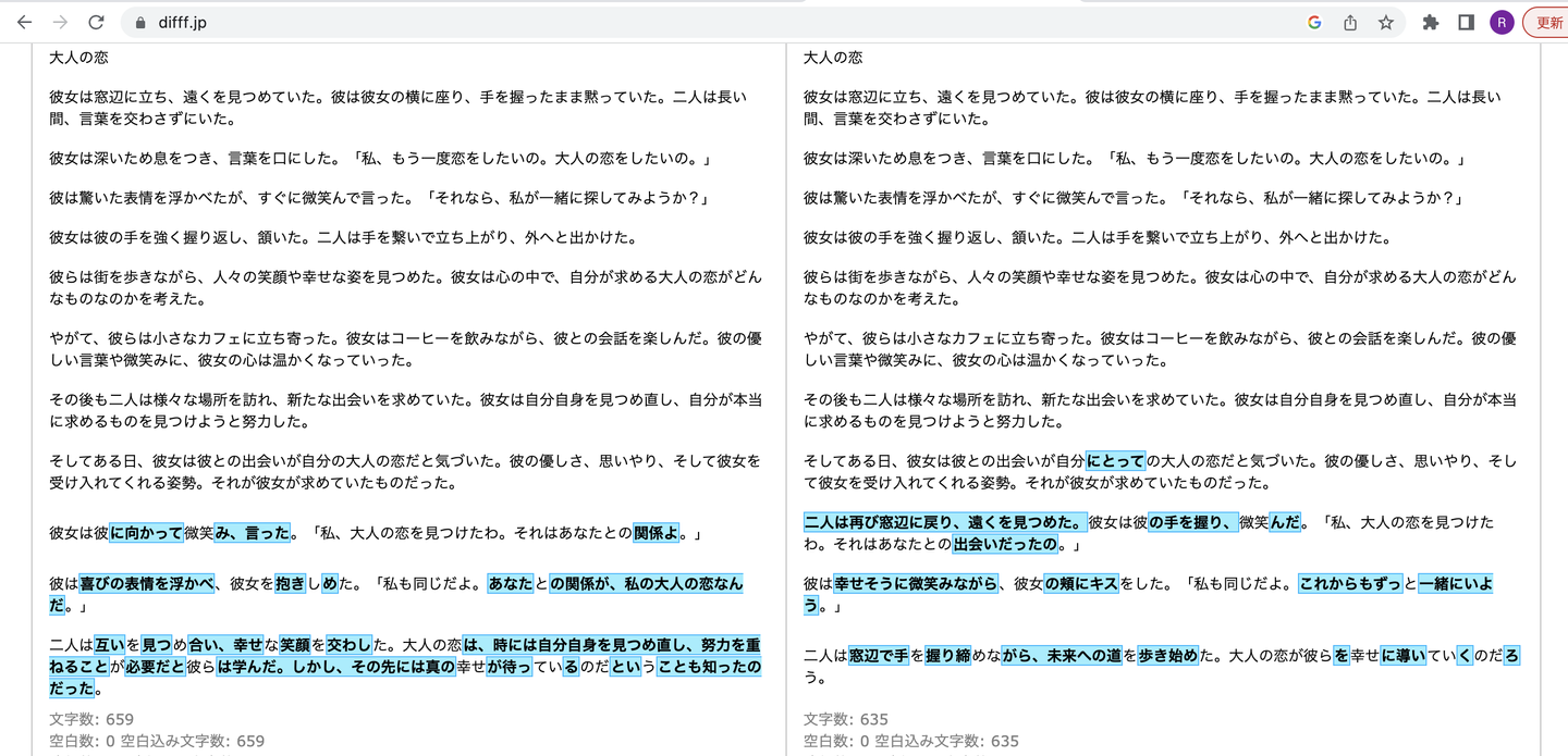中盤まで全く同じ文章が出力されていることが一目でわかりますね!
