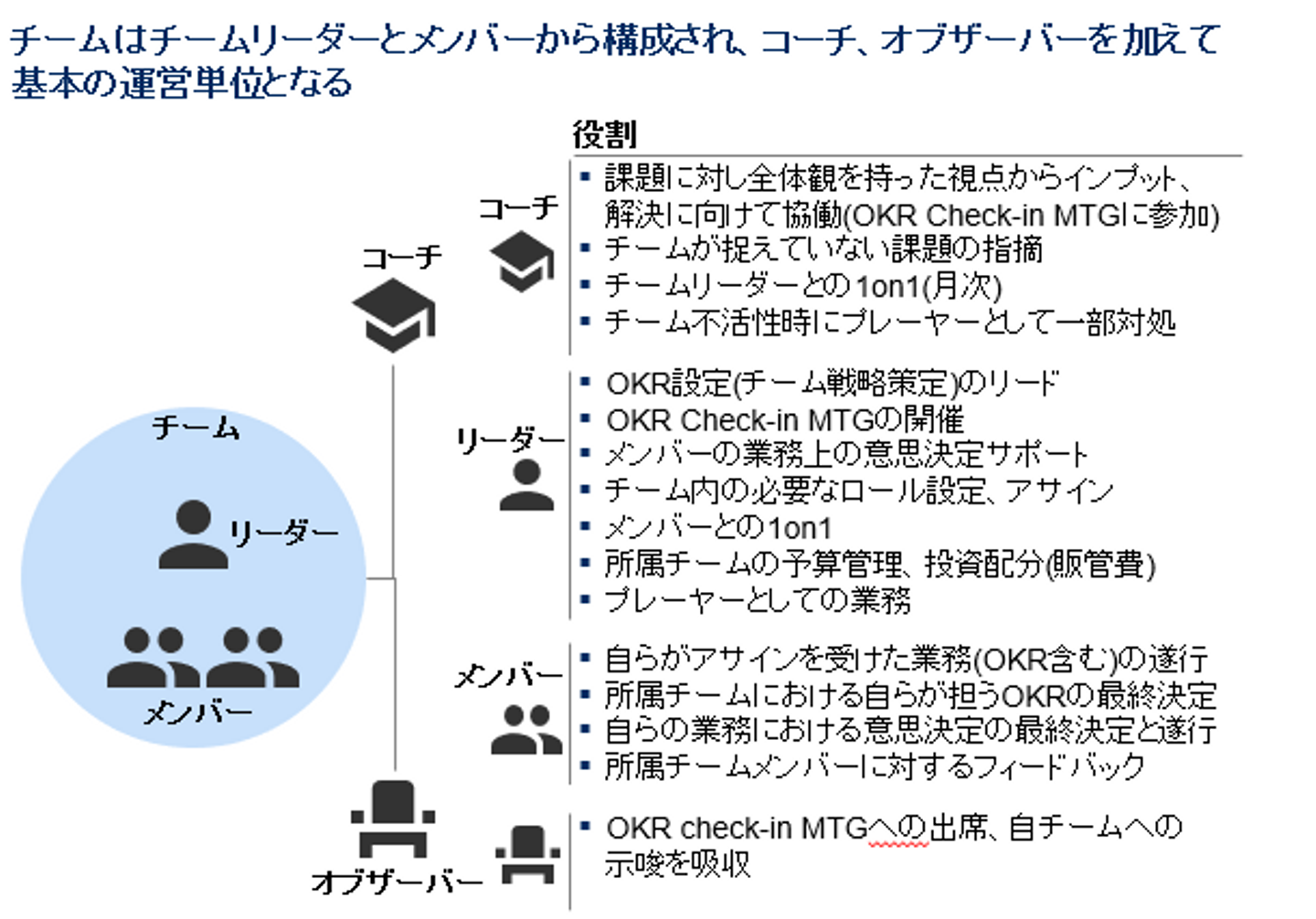 ですので、OKRを運営するうえで一番気を付けていることが、いかにこのOKRと「感情的圧力」「経済的圧力」を切り離して運営するか、ということになります。例えば通常目標管理と評価制度は結びつくことが多い(大半の企業ではMBOを個人評価と紐づけている)ですが、評価制度は「感情的/経済的圧力」と結び付きやすいものであるため、OKRの達成状況と評価制度は完全に切り離すように設計しています。また後程組織構造についても説明しますが、OKRを回す主体はあくまで現場で活動する「チーム」であり、本来上位者となるマネジメント層はOKRを達成するよう圧力をかけたり(目標必達だぞ!と怒る上司をドラマ等でよく見かけると思います)、達成に向けたアクションプランを細かく指示したりすることは役割上認められておらず、あくまでマネジメント層は「コーチ」として「チーム」の問題解決を「促進する」役割として定義しています。