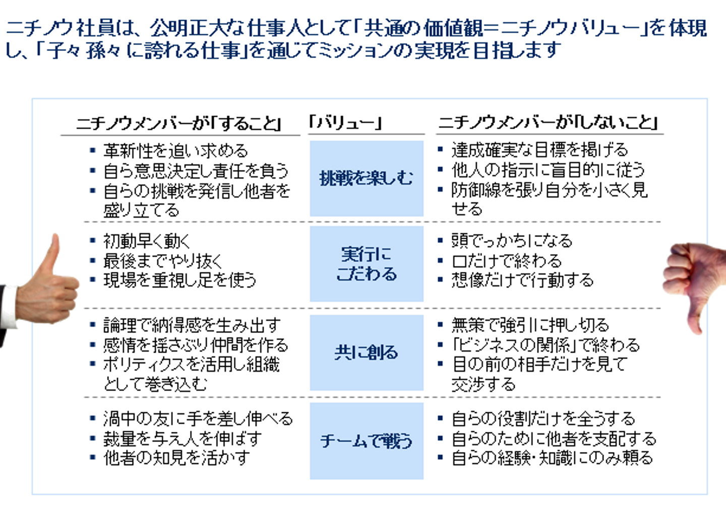 そこで3月合宿でミッションを定義するとともに、「ニチノウの社員が共通して持つべき価値観は何か?」という論点のもと、全メンバーを巻き込み議論し、ニチノウ社員は、「公正明大な仕事人」であることを前提とし、「挑戦を楽しむ」「実行にこだわる」「共に創る」「チームで戦う」という価値観=ニチノウバリューを有している必要がある、と定義しました。