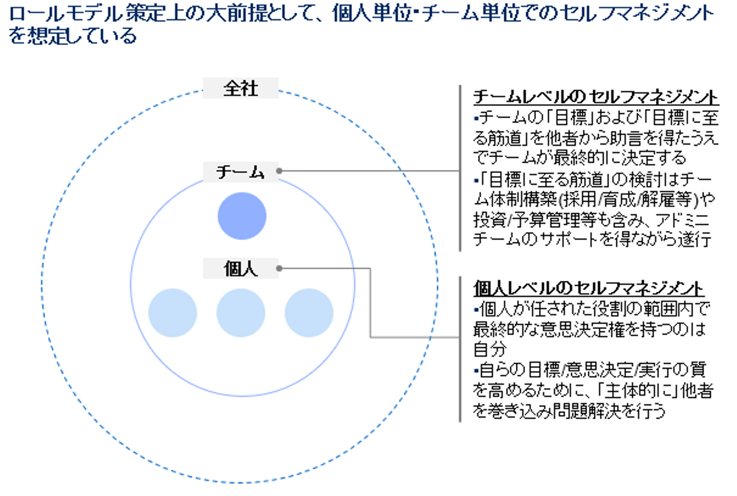 そこで重要になるのが自らの課題に対して意思決定をするのは自分自身、というセルフマネジメントの意識となります。あくまで他者からの助言は「意見」であり、仮に社長からの助言であっても、自らの意思決定の質をあげるために必要な「意見」であり「命令」ではない、という意識を持ち、得た助言を取捨選択し自らのポジションを明確にする必要があります。つまり「自律性」「連携性」の要素はあくまで「自律性」が先に立つものであり、その自律性を保管するために「連携性=集合知」が必要となる、という明確な優先順位があります。