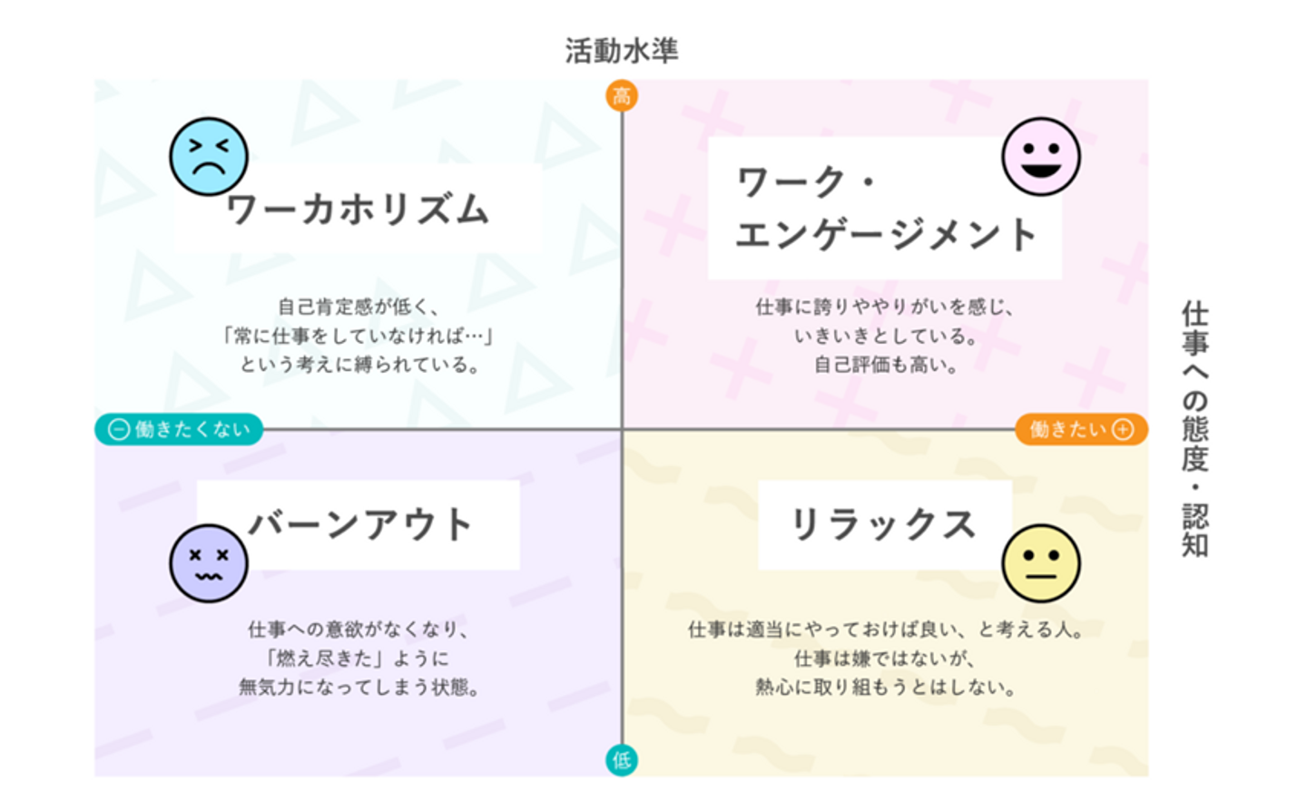 この4象限のグラフを見ると分かりやすいのですが、昨今盛んに行われている「働き方改革」で残業時間の削減や定時退社日の設定など、「仕事量を減らす=活動水準を減じる」ことそれ自体は必ずしもワークエンゲージメントの向上に直接良い影響を与えるものではありません。