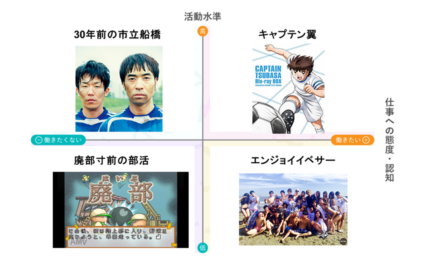 上記を踏まえて、サッカーの例でワークエンゲージメント状態を例えると下記のようになると考えています。