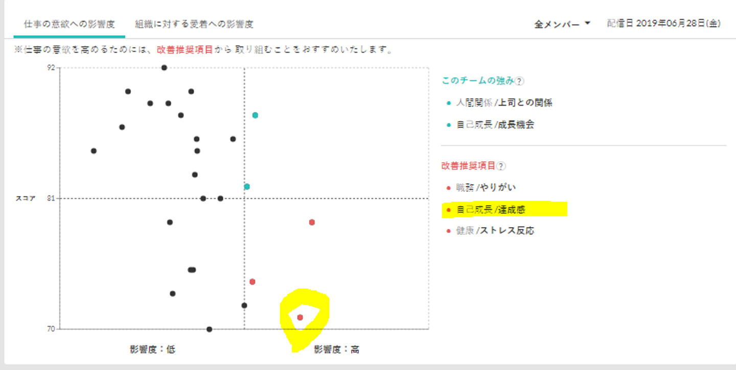 一方で、大きな発見もありました。下記が「影響度分析」のスクリーンショットなのですが、仕事に対する意欲に対して「達成感の実感」は高い影響度があるものの、スコアが低く改善の余地が必要となっています。これまで意識したことがなかったポイントではあったのですが、この結果を踏まえて、毎週金曜日に行っているWin-sessionのスタイルを変えてみたり(自分でwinを発表するスタイルから他の人のwinを発表して賞賛する)、月次で1on1で話す内容についても「当月で達成をできたこと」によりフォーカスする内容に変更したりと、改善のアクションを考える上での端緒となっています。