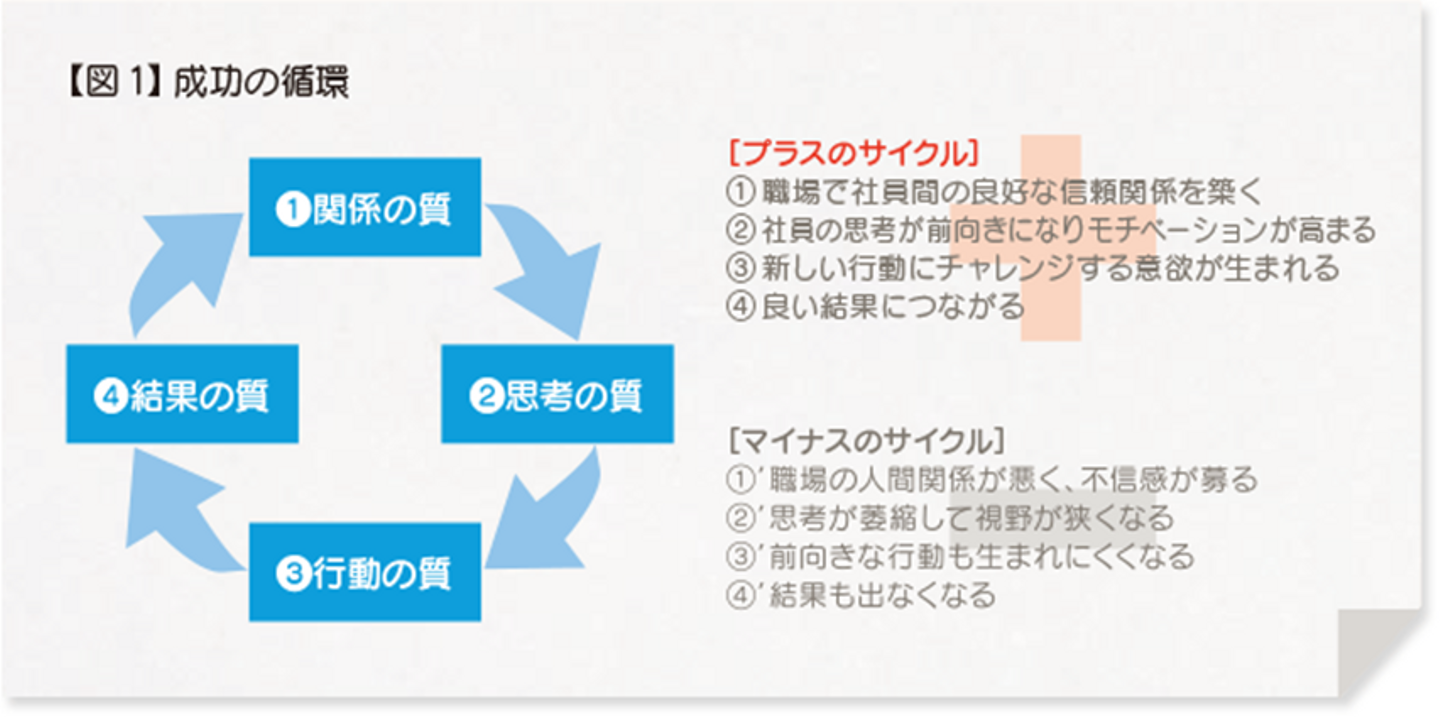 また「成果の質」が高まれば、常勝状態にあるチームがそうであるように組織の雰囲気自体もさらに良くなり「関係性の質」がさらに高まり陽のスパイラルに入ると主張しています。