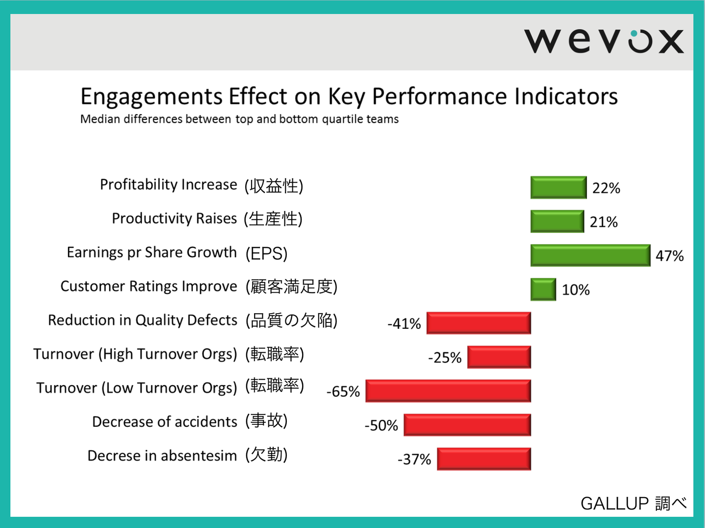 ワークエンゲージメントの高い組織とそうでない組織とでは、例えば離職率が倍以上の差が出たり、収益性の観点でも+22%の差が出たり、「成果の質」の差に如実な差が出ています。