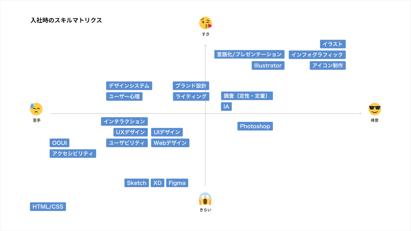 ただ、Web、UIに関する知見や制作経験は全く無かったため、それに関わるスキルは「苦手」や「きらい」に含まれている傾向があります。