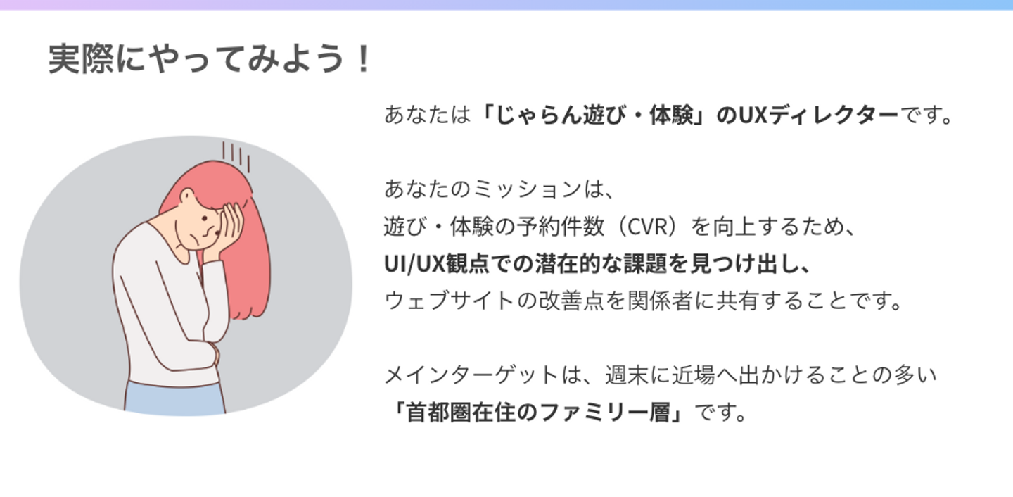 今回のワークショップでは、リクルートでサービス展開している「じゃらん遊び・体験のUXディレクター」になった設定で行いました。