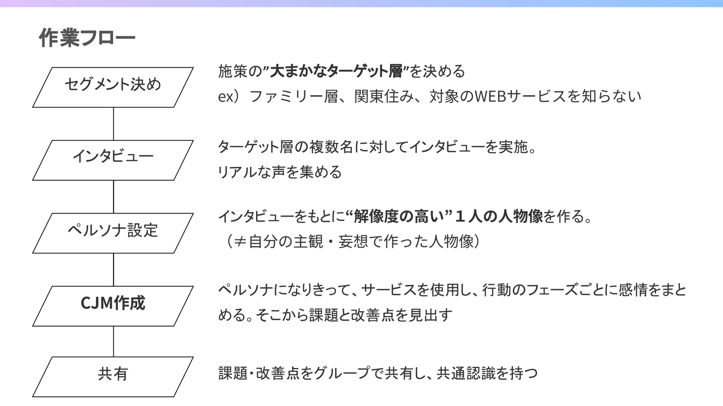 ワークショップでは、一般的にUI UXの現場で活用されている「ユーザーインタビュー」「ペルソナ設定」「カスタマージャーニーマップ作成」を実践しました。