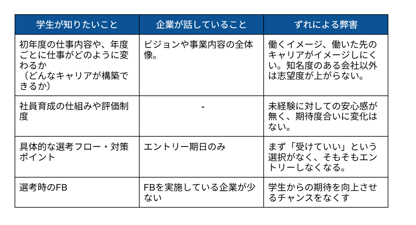 現場で学生と話しているとよく感じるのは、「学生が知りたいこと」と「企業が伝えること」がズレているということ。
