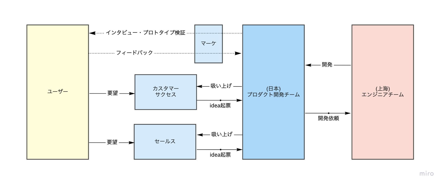 回答:日本のプロダクト開発チーム5名と上海のエンジニアチーム25名が連携して開発をしています。日本のプロダクト開発チームはUXリサーチ、ユーザーフィードバックの集約と整理、プロトタイプ制作〜仮説検証など企画業務を担い、上海のエンジニアチームではメインの開発業務を担う、という役割分担です。またユーザーフィードバックはプロダクト開発チームがセールス、カスタマーサクセスから集約して、それらをベースにプロダクト企画会議でボード、マーケティング、関係者が議論して製品に反映しています。新規サービスの研究開発は、日本・上海、いずれのチームでも行っていますね。