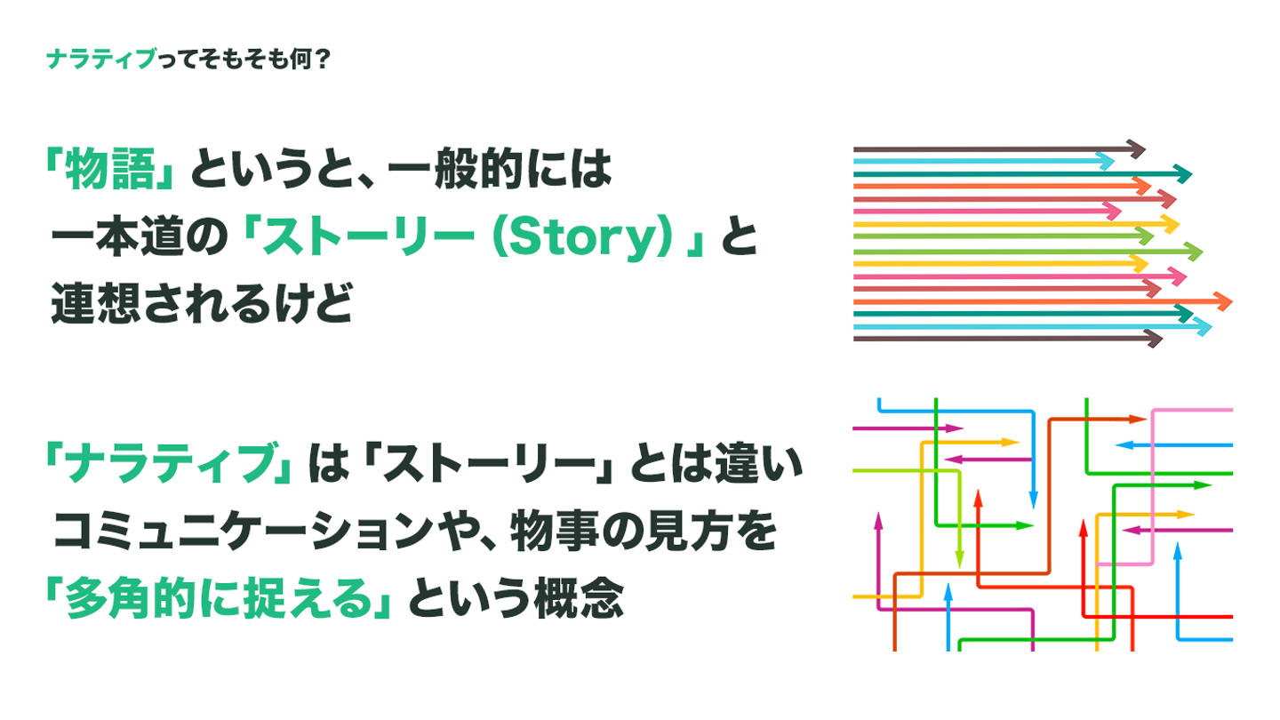ナラティブ(NARRATIVE)とは、日本語に訳すと「物語」となりますが、「物語」といっても映画や小説のように「一本道のストーリー」ではなく、簡単に言うと「物事を多角的に見る概念」を「ナラティブ」と言います。