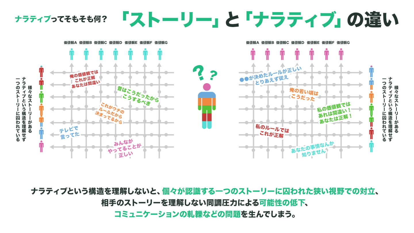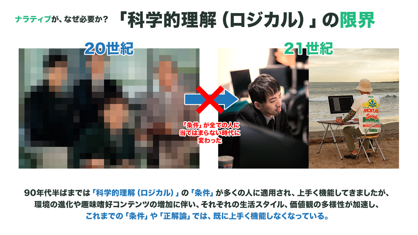 「ナラティブ」なコミュニケーションがなぜ必要かというと、私達の社会が20世紀から21世紀と時代が変わっていくにつれて、趣味嗜好、生活スタイル、価値観、状況といった、それぞれが持つ「文脈という物語」が「多様化」し、20世紀まで皆が共有してきた「常識」「普通」「ルール」といった、当たり前に信じられてきた「正解」が上手く機能しなくなってきています。