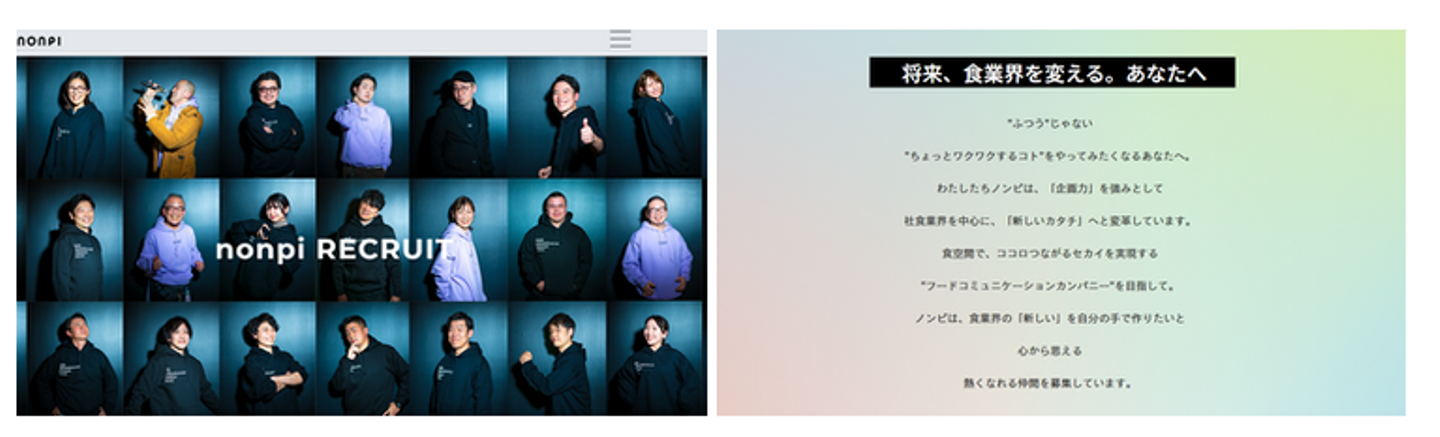 単なる受託企業ではなく、FOOD COMMUNICATION COMPANYを目指していることの認知を広げていくために、社員1人1人がノンピのレシピ(行動指針)の実践している人をnonpist(ノンピスト)と呼び、それらの行動が企業の成長へと繋がってくと考えています。