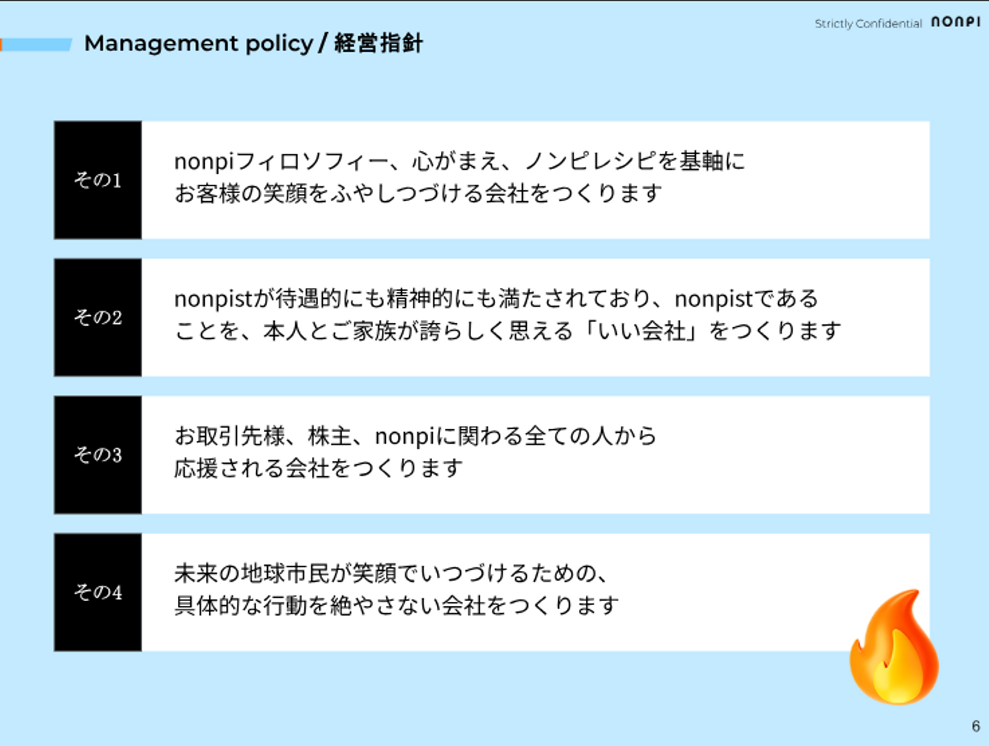 マネジメントポリシーを策定し発表したのがちょうど2年前になります。それから今日までの間、多くの課題に直面しましたが、マネジメントポリシーを軸に、まずはお客様の笑顔、次に従業員の幸せ、そしてその次にお取引先様や株主様への恩返し、最後に未来の地球市民の笑顔というように、意思決定の優先順位を明確にしながら、ぶれることなく前進してきました。経営は「or」ではなく「and」であり、ノンピに関わってくださる方々全員の笑顔や幸せを最大化することが私たちの仕事だということは重々理解しているつもりですが、時間やリソースが限られている中で、このマネジメントポリシーは非常に重要な役割を果たしてくれたと実感しています。そして、難しい意思決定の際には、出来る限りマネジメントポリシーを軸に真摯に社員と向き合い未来像を共有することを大切にしました。会話の際は変化に対する不安を払拭し、前向きな意識を育むためのコミュニケーションは必要不可欠な重要要素で、常に「変革こそ成長の源」と信じて、日々その実現に向けて努力しています。