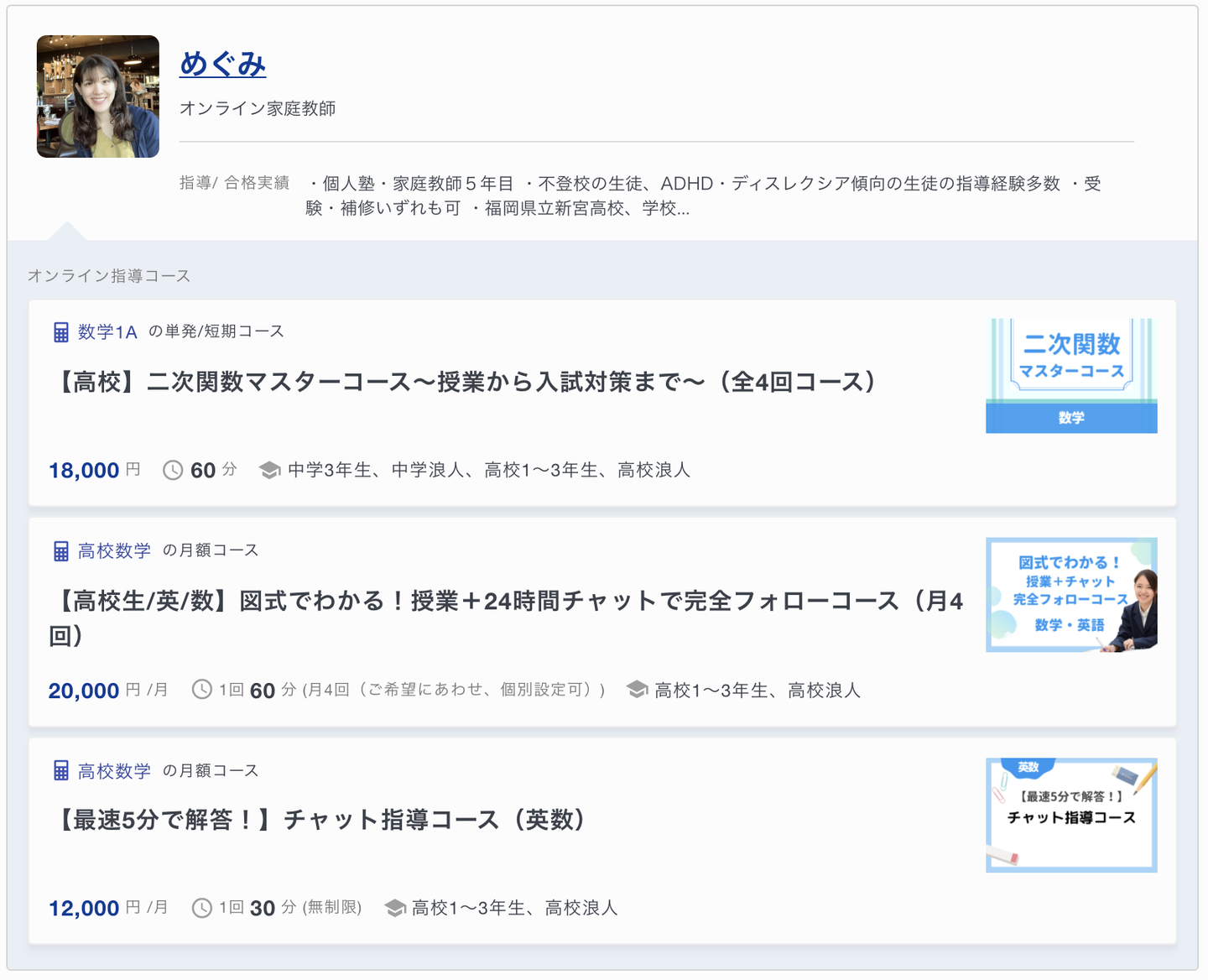 例えば弊社ですと、オンライン家庭教師の一覧画面で、各先生にその先生が用意しているオンライン指導のプラン(指導コースと呼んでいます)を 最大 3 件付帯して表示する、という要件がありました。