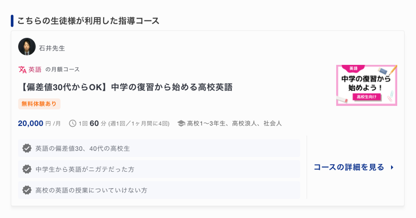 また、感謝の声ページには、感謝の声を投稿した生徒さんがどんな指導コースを利用していたかが合わせて表示されます。