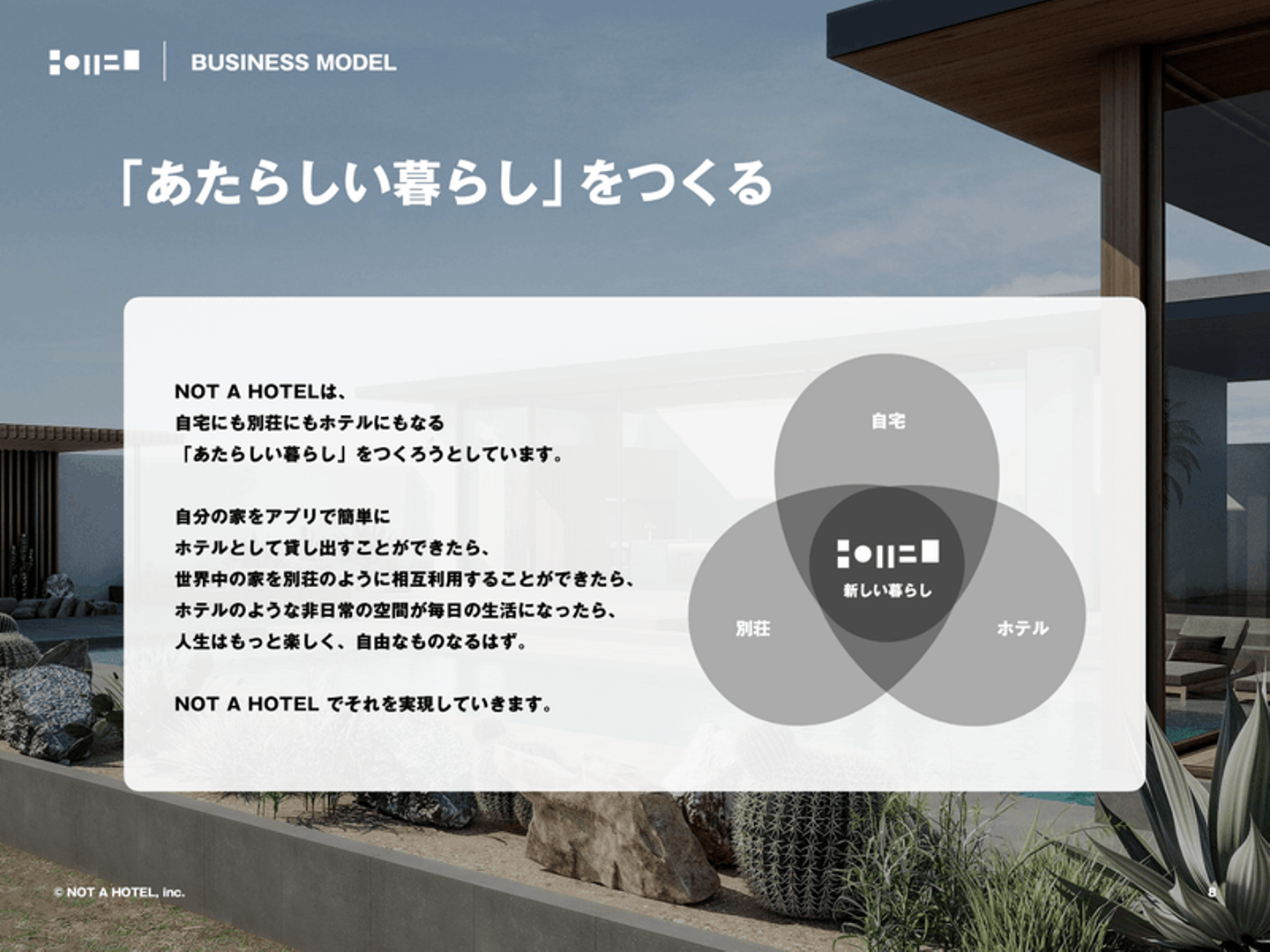 NOT A HOTEL を端的に説明するならば、わたしたちが目指す「あたらしい暮らし」という言葉が適切でしょう。サービス名でもあり、販売している建物の名前でもあり、わたしたちの会社の名前でもありますが、一番に伝えたいことは暮らしをより自由にするための「あたらしい暮らし」の概念についてです。