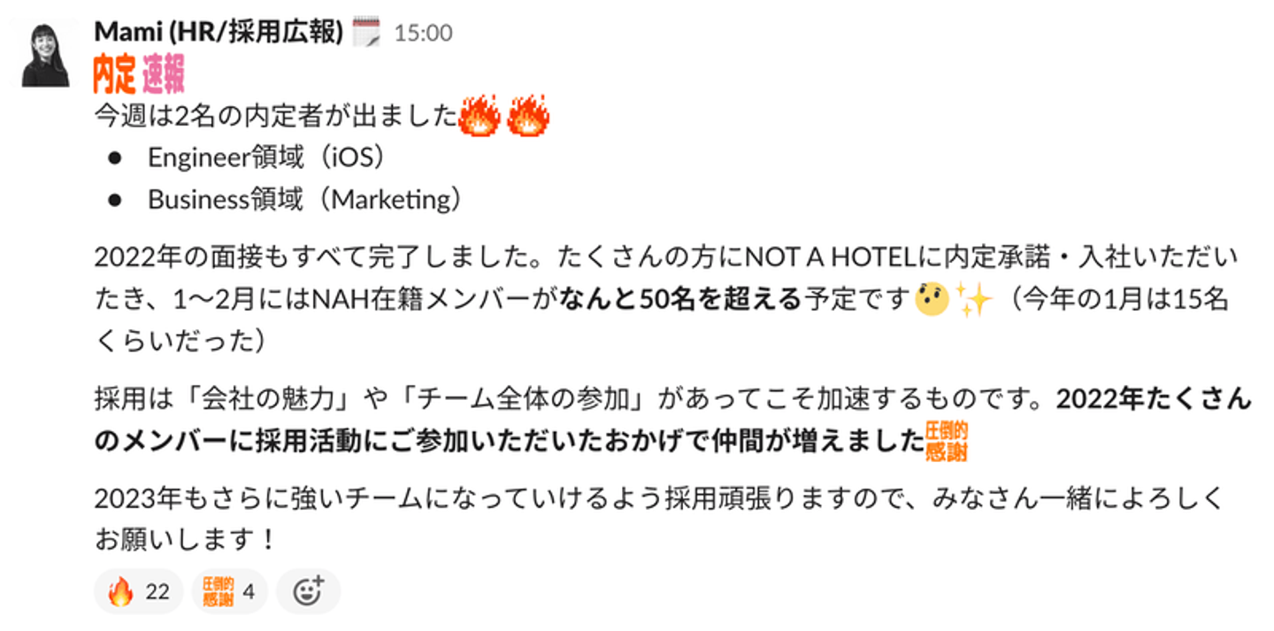 こんにちは、NOT A HOTEL HRの冨永(@mamiracle__)です。2022年3月1日にNOT A HOTELにジョインして、あっという間に1年が経ちました。この1年間で18名から約60名までメンバーが増えたNOT A HOTELで、HRとしてどのような取り組みをしたのか採用を中心に振り返ります。