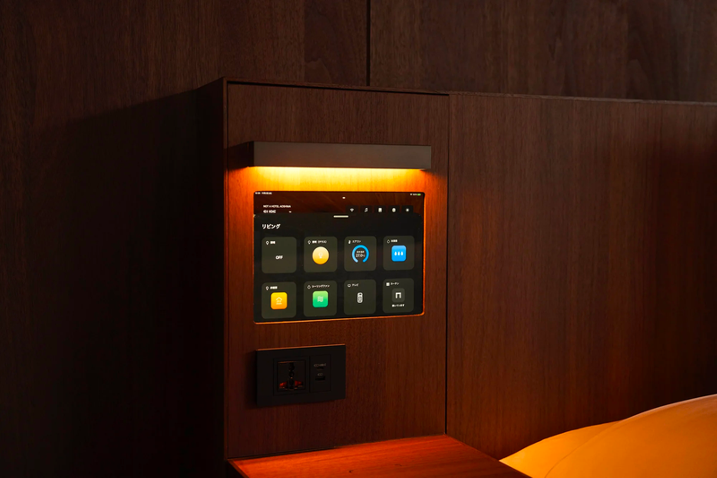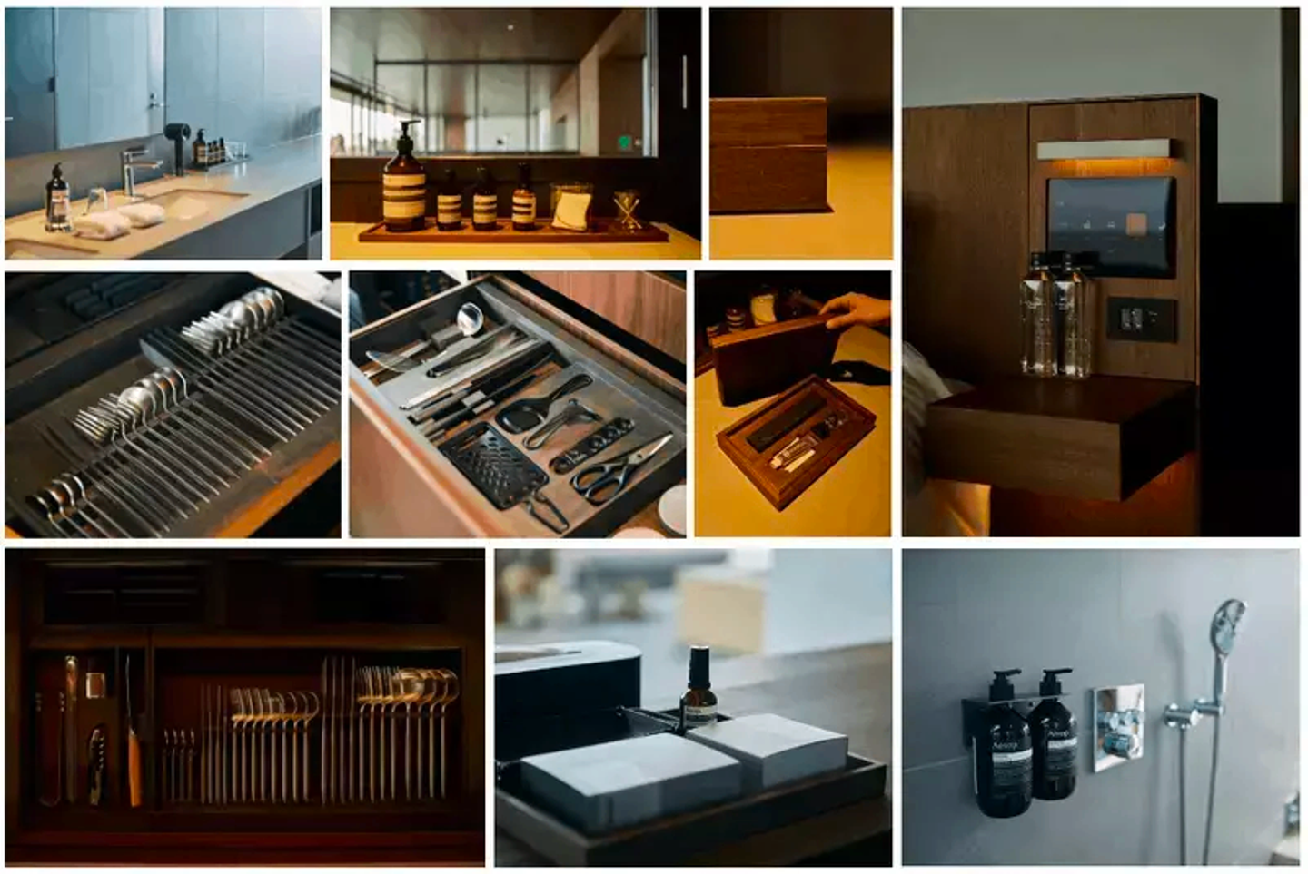 美しく並ぶカトラリーケースや洗面台のアメニティがぴったり並ぶトレイ、さらにはスマートホーム対応のタブレッド埋め込み型のベッドなども自社で開発