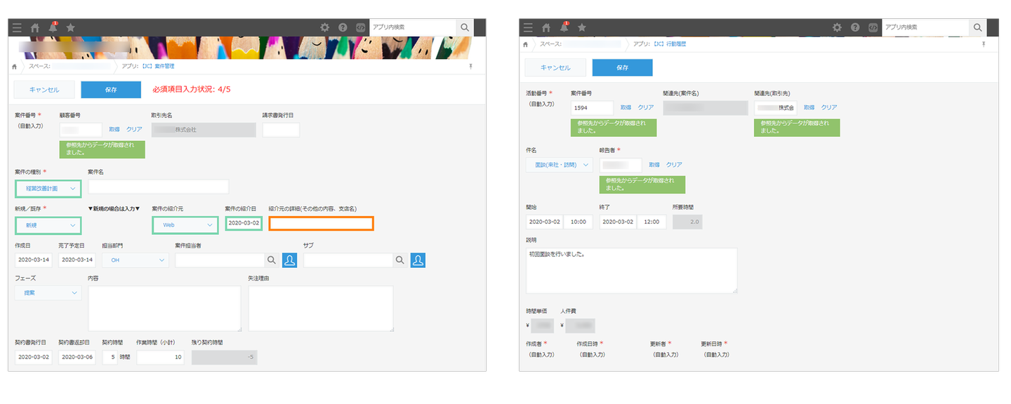担当者は案件管理アプリから「行動管理」を登録。案件管理アプリで各案件にかけた工数を計算・受注金額からの利益率を自動算出させました。
