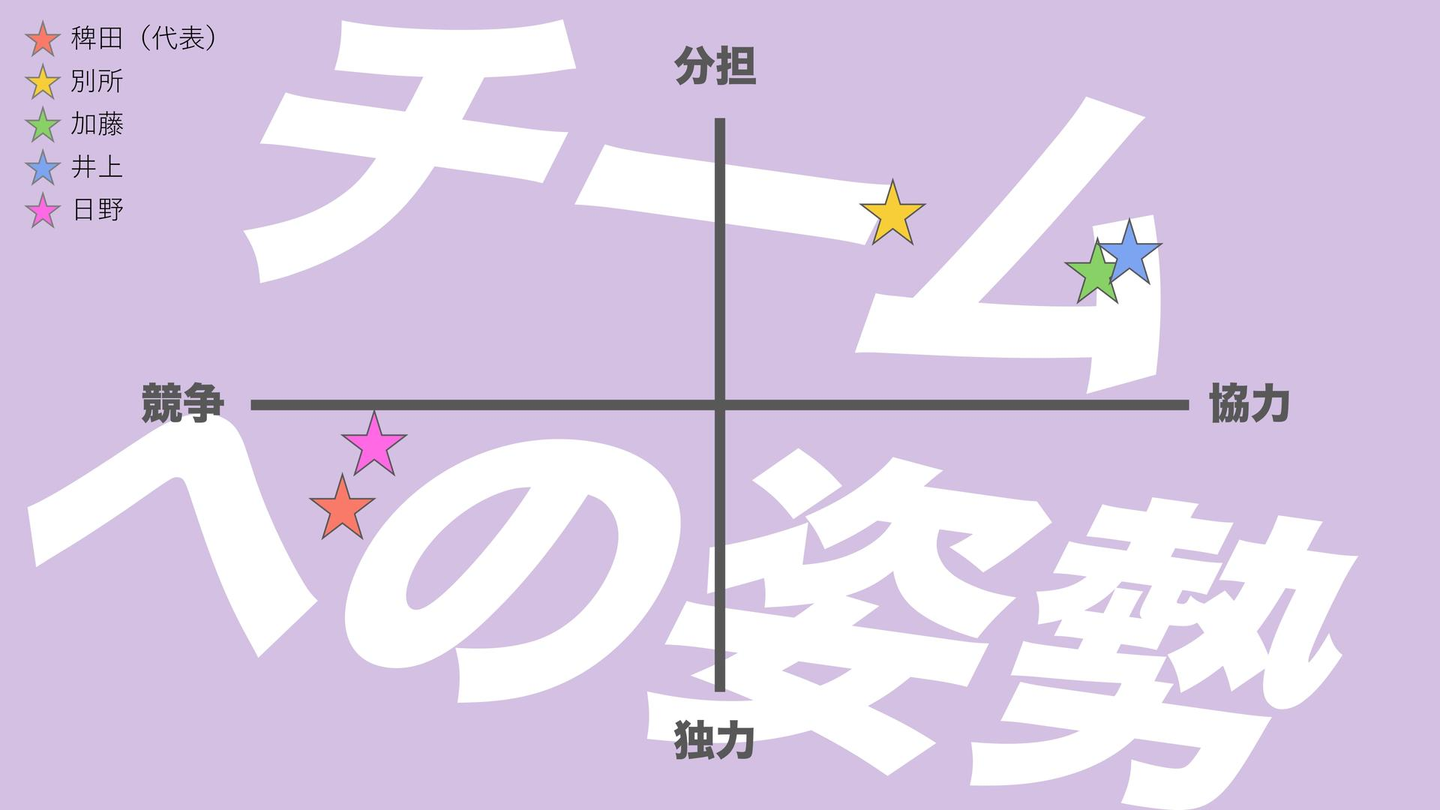 別所・加藤・井上は、仲間意識が強く互いを大事にする傾向があり、みんなで協力して目的を達成できると満足感が高いみたい。