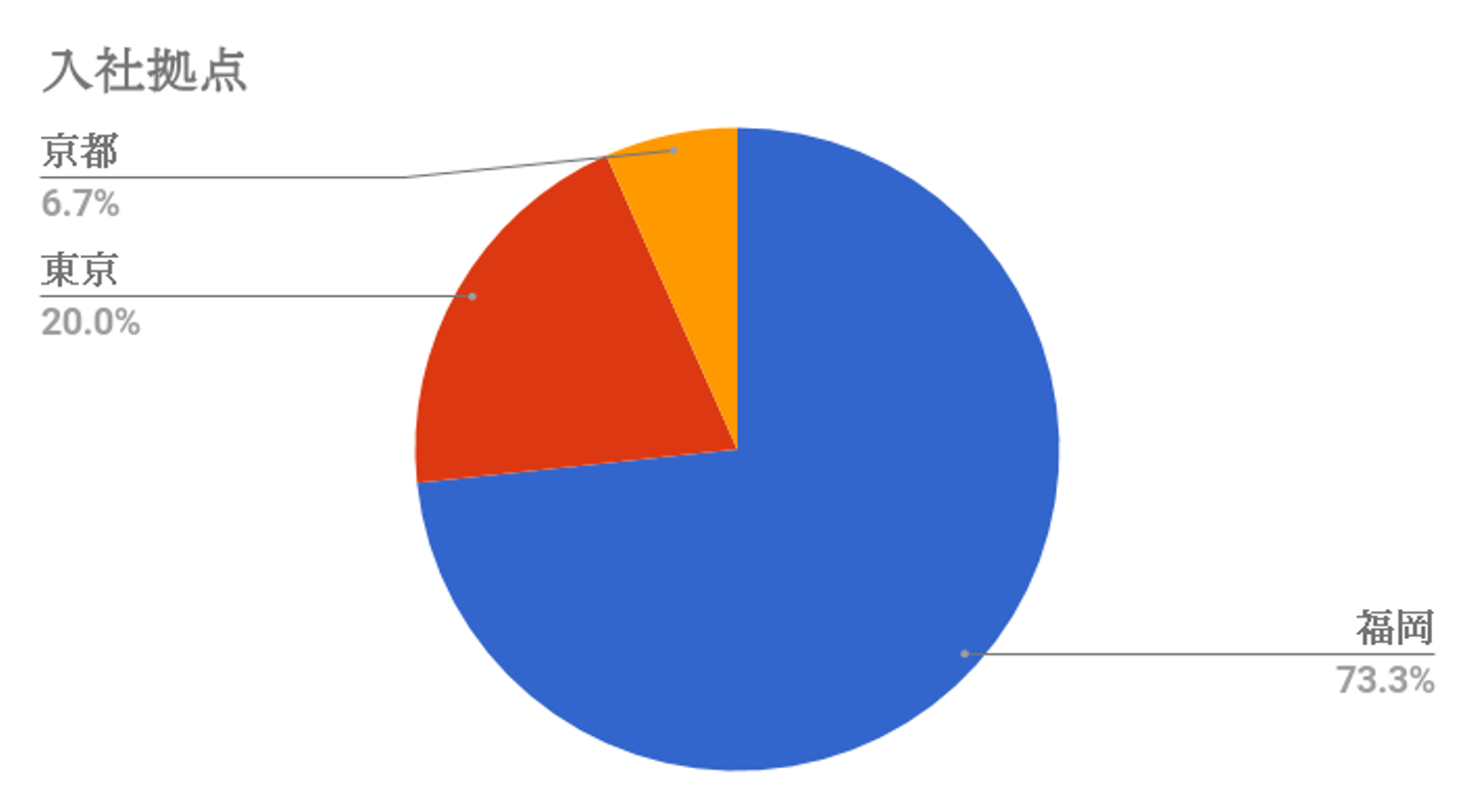 の3拠点を持っており、特に採用比率が高いエンジニアは、拠点を選びやすいため、満遍なく採用活動ができるのが良い点です。体感よりも福岡での採用割合が大きく、東京での採用が少なく見えるのが意外でした。