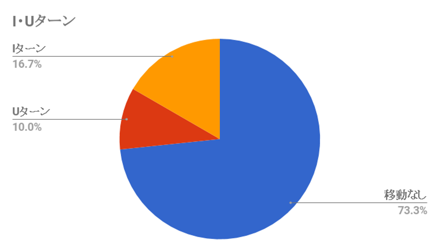 転居を伴う入社の場合でも、I・Uターンにカウントしていない人がいたり、入社後しばらくしてからUターンの場合もあるため、1つ前のデータとはズレを感じる点もありますが、大まかにはこのような形です。