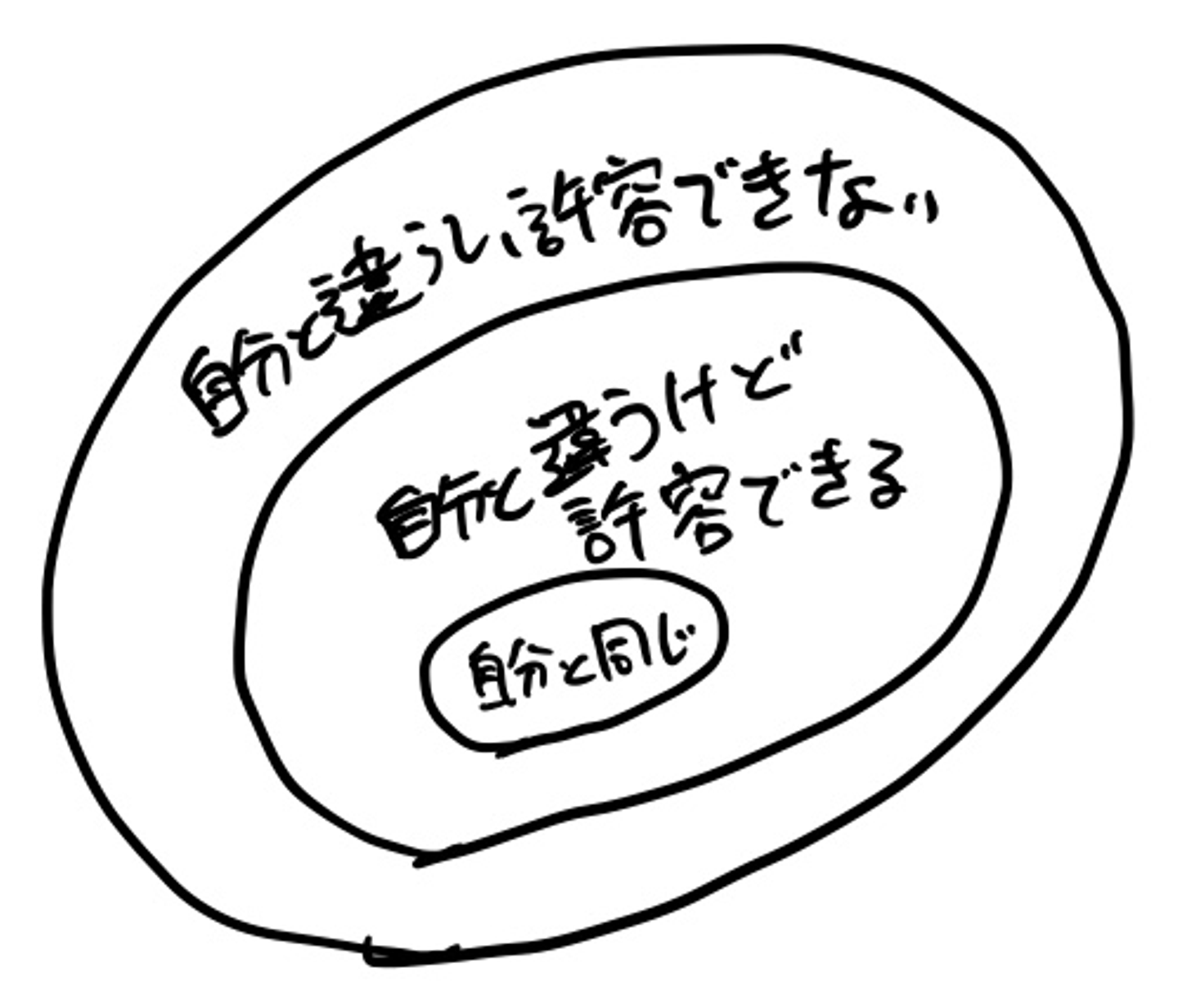 許容範囲を広げ過ぎると、こだわりのないような人に見えてくるかもしれませんが、実はそうなっている状態こそが一番大事なことを見つけている状況かもしれません。許容範囲を広げた、二重丸目が全体の面積の大半を占め出したとき、許容できないことは非常に少ない状態で、且つ、「自分と同じ(絶対に譲れないこだわり)」の部分が小さく、非常に研ぎ澄まされた状態になっているのかなと思います。