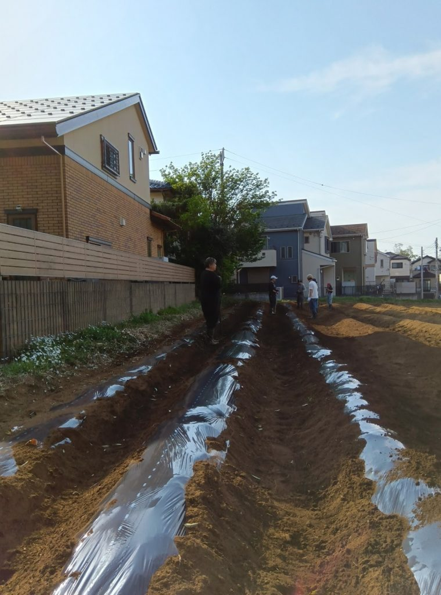 畝の上には “マルチ” と呼ばれる黒いビニールをかけます。雑草防除や保温・保湿、害虫対策のための大切な作業です。