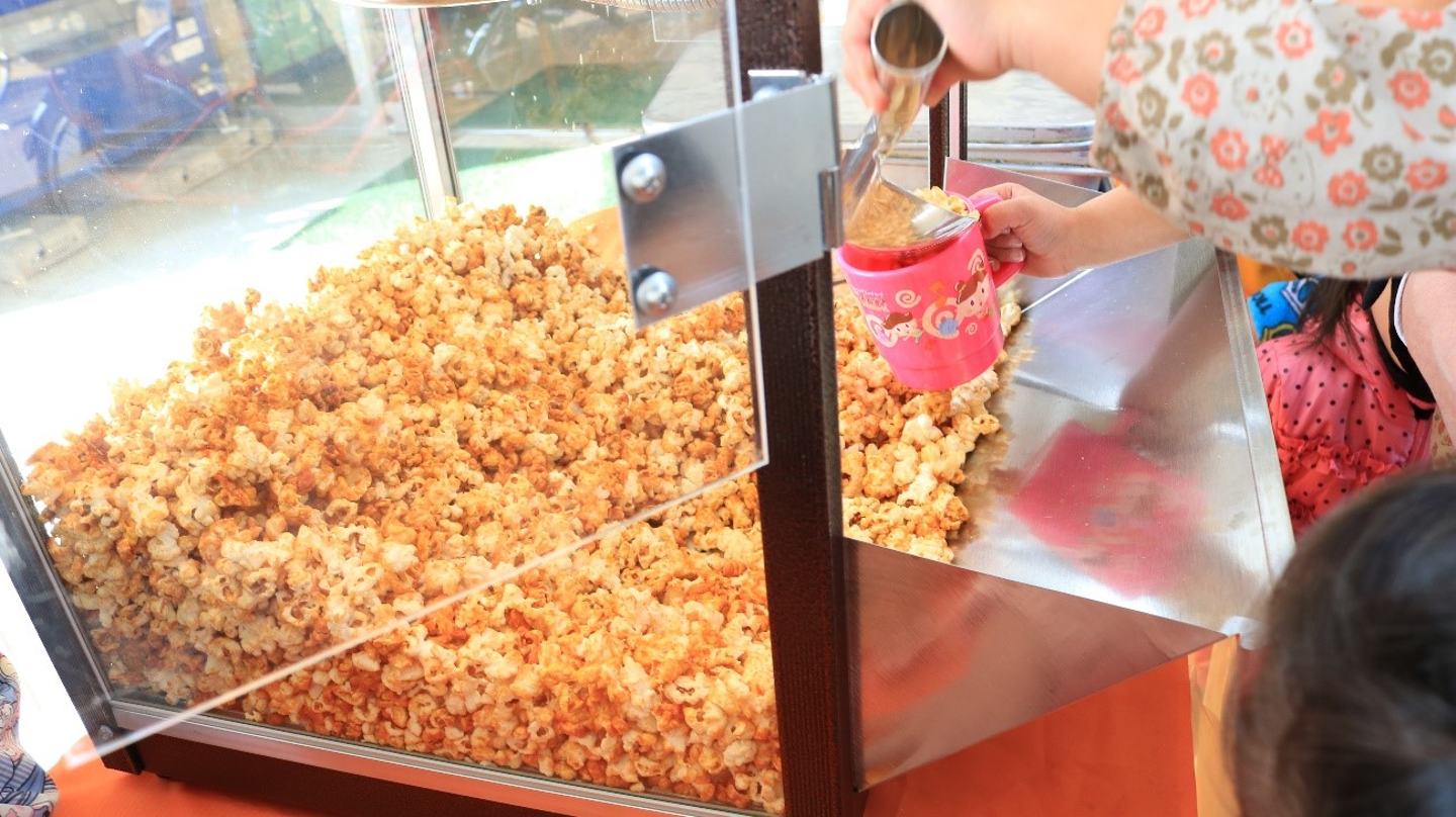 出来立てのポップコーンをできるだけ多く容器に入れようとみんな真剣です。溢れているにも関わらず、さらにコップに入れようとする子も。
