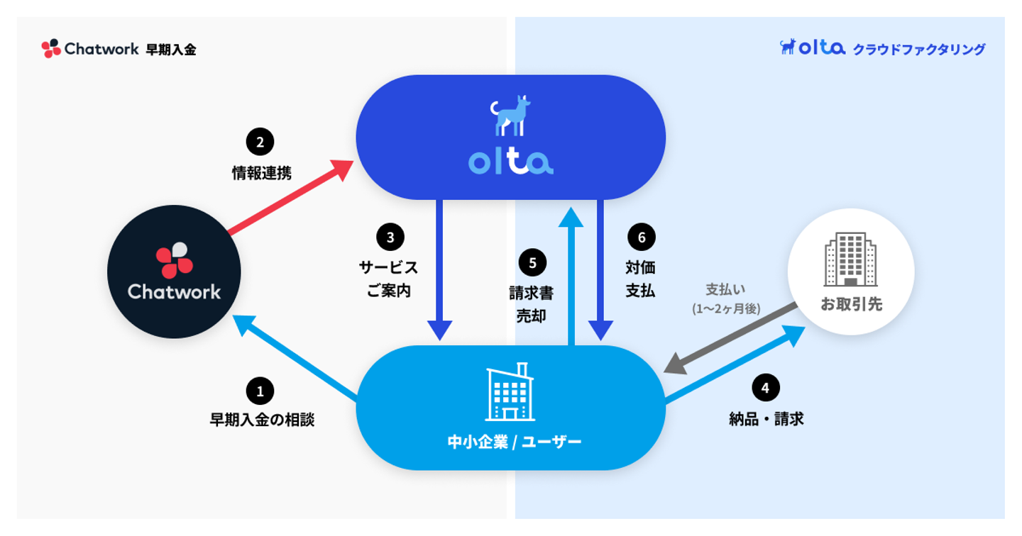 「Chatwork 早期入金 powered by OLTA」は、ビジネスチャット「Chatwork」上において、ユーザーから早期入金の相談を受けたのち、OLTAのクラウドファクタリングへつなぐサービスです。