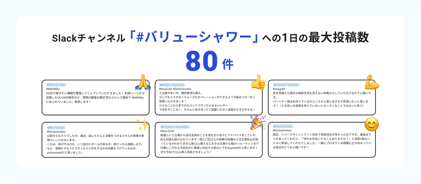 Slackチャンネル「#バリューシャワー」には、メンバーへの気付きや感謝がリアルタイムで投稿されています。多い日は1日で80件の投稿が集まることも。