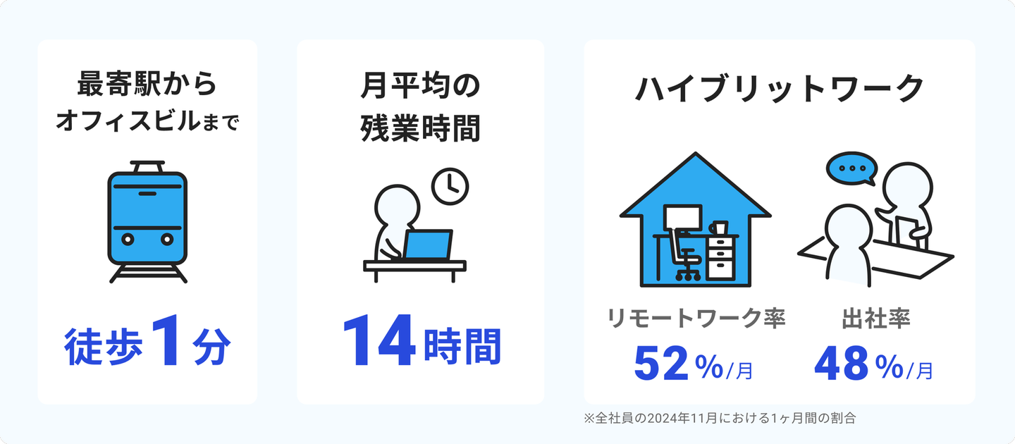 働き方は出社とリモートのハイブリッド型で、1ヶ月間のリモートワーク率は52%。出社時には仲間とのコミュニケーションを活かし、自宅では集中して作業を進めるなど、パフォーマンス向上に向けて柔軟な働き方を実現しています。(※配属部署によって出社頻度は異なりますが、週2・3回出社をしています)