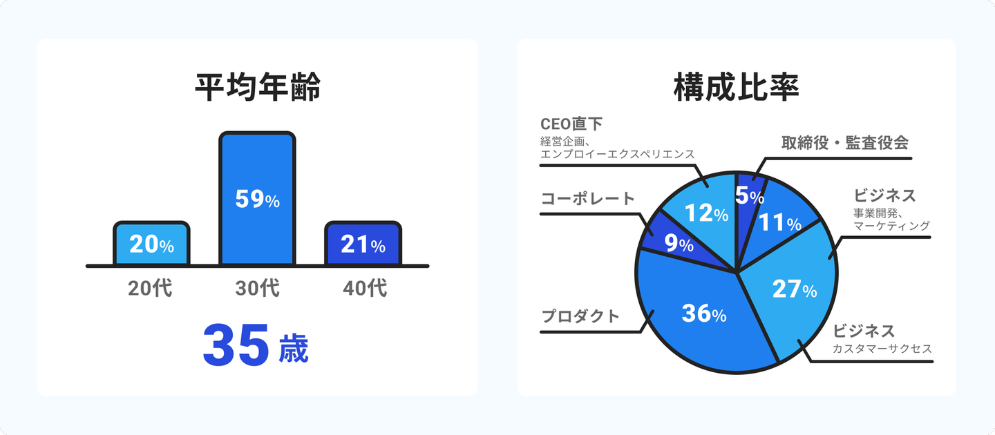 職種はビジネス、プロダクト、コーポレートなど多岐にわたり、さまざまなスキルや知識を持ったプロフェッショナルが集結。それぞれが個性と強みを活かしながら、ベンチャーマインドを持ってチャレンジを続けています!