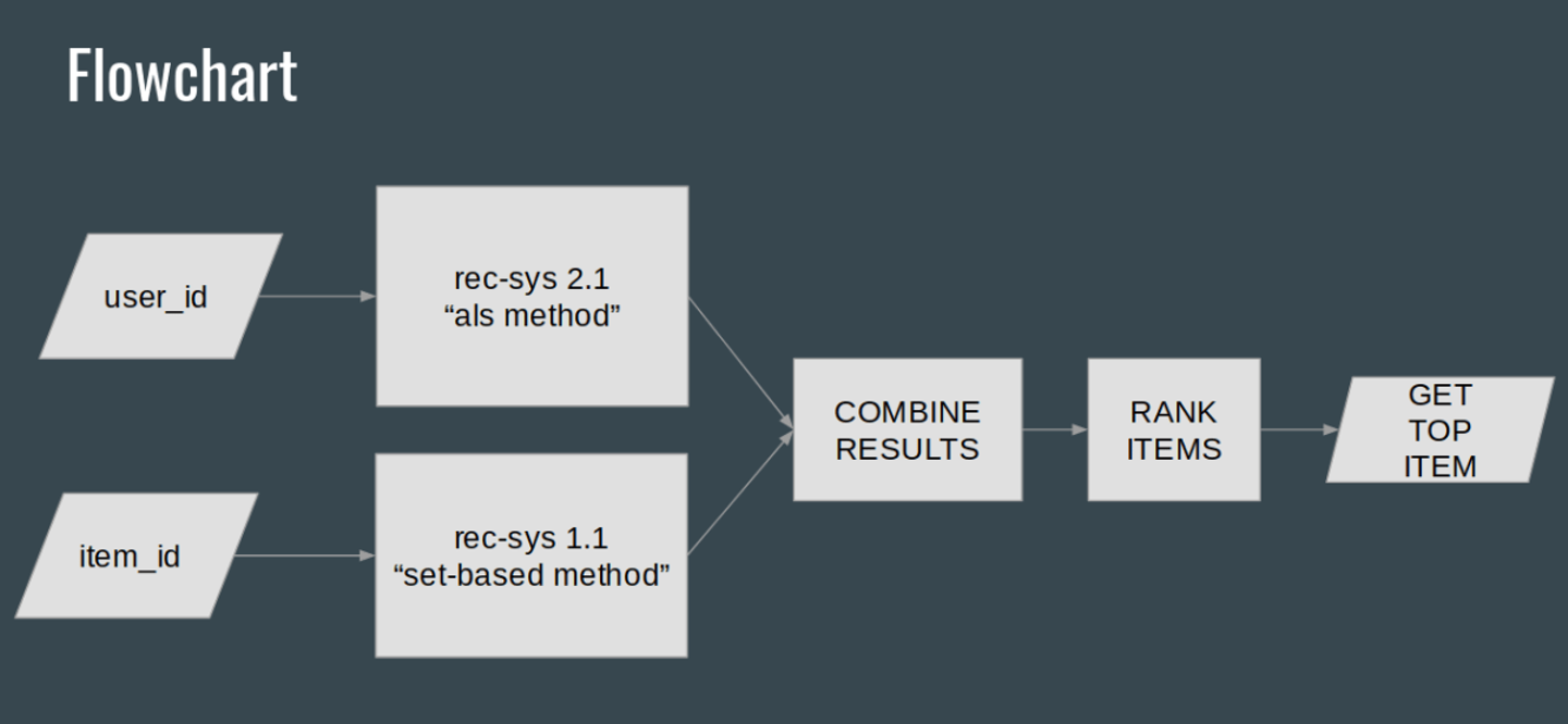全体の流れはユーザーのIDと閲覧しているアイテムIDをそれぞれ専用の機械学習のモデルを通してアイテムをスコアリングして上位9アイテムを表示しています。