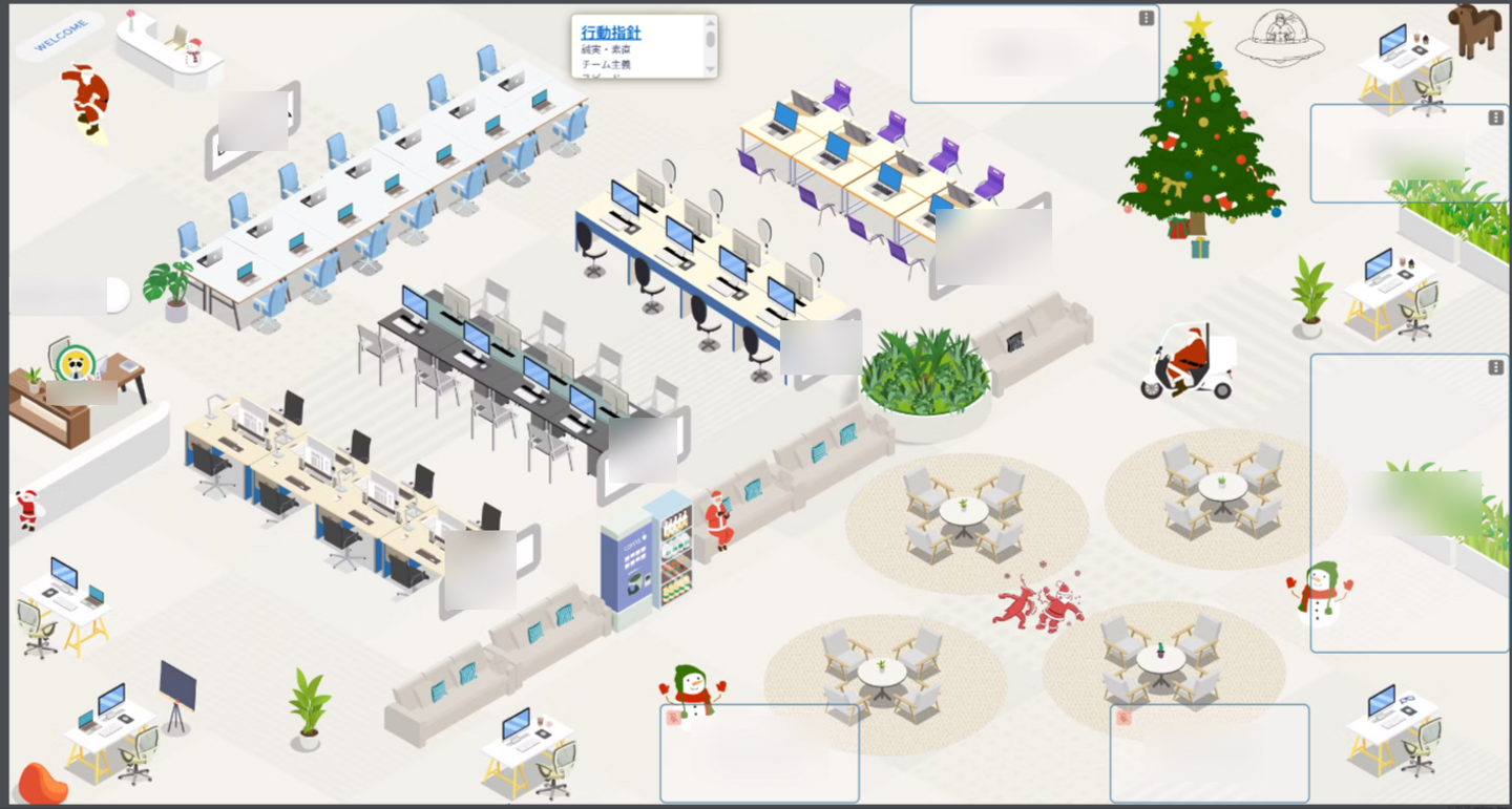 自分のアイコンを「応対可」「作業中」など状態を変更することができ、オンライン会議室や誰からも話しかけられないサイレントルームなど、リアルなオフィス同様に使っています。クリエイティブチームが時期にあわせてオフィスを装飾してくれてたり、模様替えをたまに行っています。