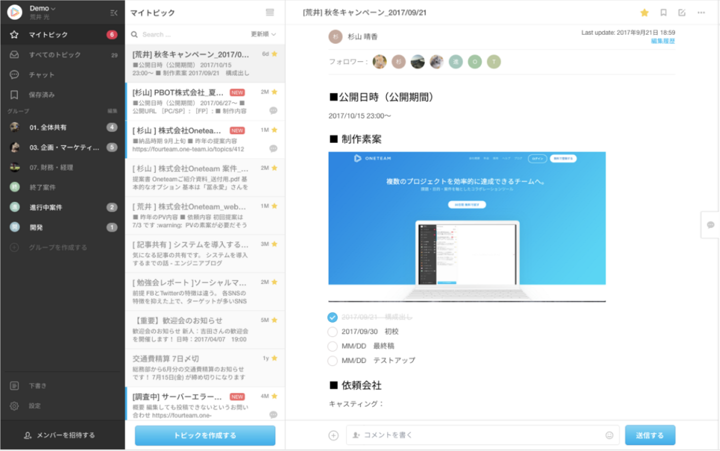 Oneteam独自の「トピック機能」により、チャットとは違って議題・案件ごとにやり取りができることが大きな特徴です。