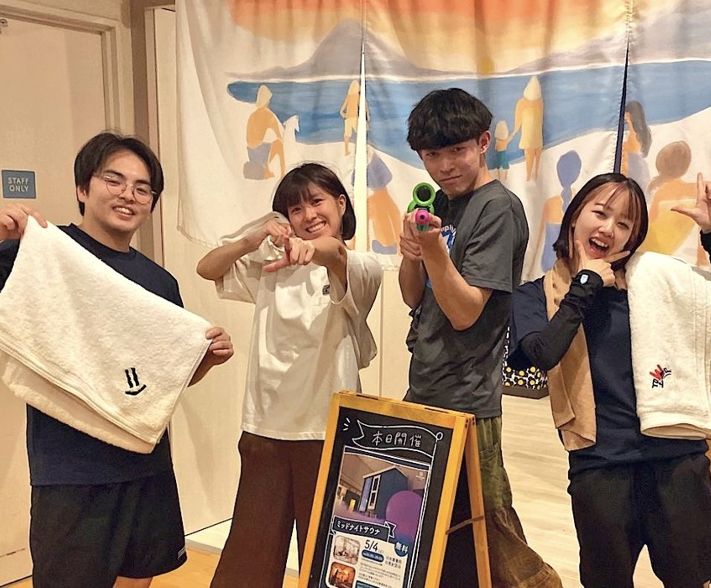 アウフグースにも興味があったので、おふろcafé 専属アウフギーサー(熱波師)でもある「たま助」さんに弟子入りをお願いしました。仕事終わりにタオルの振り方や演出の仕方などを積極的に学びました。タオルを振り始めて1週間でお客さまの前で念願のアウフギーサーデビューを果たし、インターン最終日には卒業アウフグースとしてイベントも行いました。福岡から埼玉に来たこともあり最初は不安だらけでしたが、自らやりたいことや店舗の課題感を発信することでさまざまな経験ができたインターンになりました。
