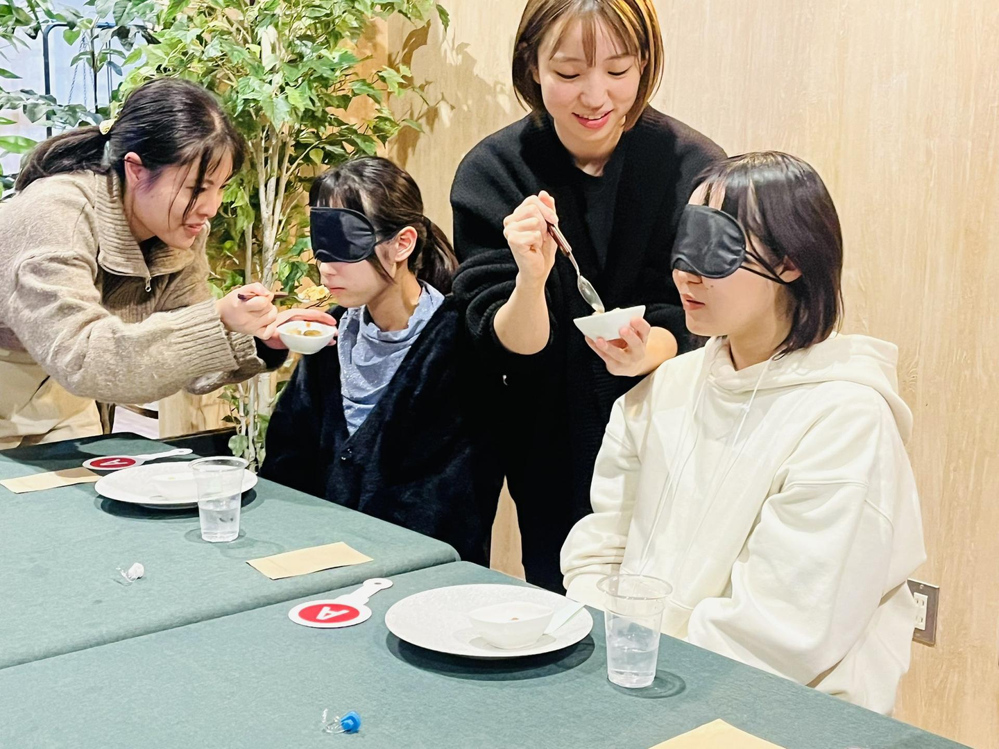 ルールはシンプル、ワインやお食事を目隠しで味わい、2つのうちどちらが「高級品」なのかを当てます。普段、美味しいものを食べている人たちなら楽勝!と思いきや、一筋縄ではいきません。飲食・役員チームが軒並み間違えるなどの大波乱!! 結果は、新卒女子メンバーが優勝という下剋上が起こりました。