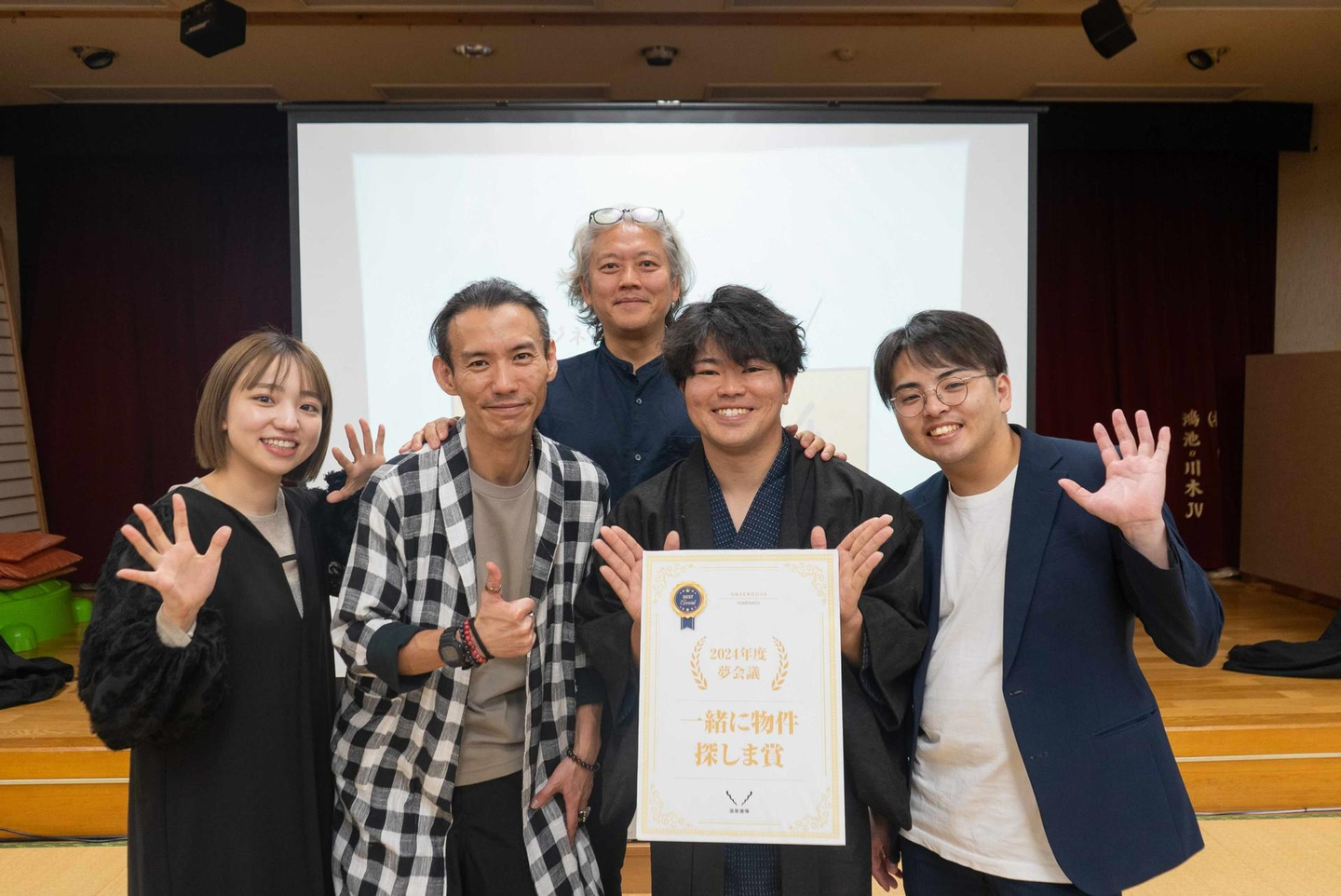 そして4名の発表が終わり、厳正な審査が行れました。結果、武甲温泉 佐伯さんが「一緒に物件探しま賞」を受賞しました。武士のごとく着物姿で現れた佐伯さん。新しいおふろcafé 業態をやりたいというプレゼンは過去にもありましたが、実際に物件を探したという点と、佐伯さんのプレゼンテーションに皆引き込まれたという点が評価されました。おめでとうございます!!