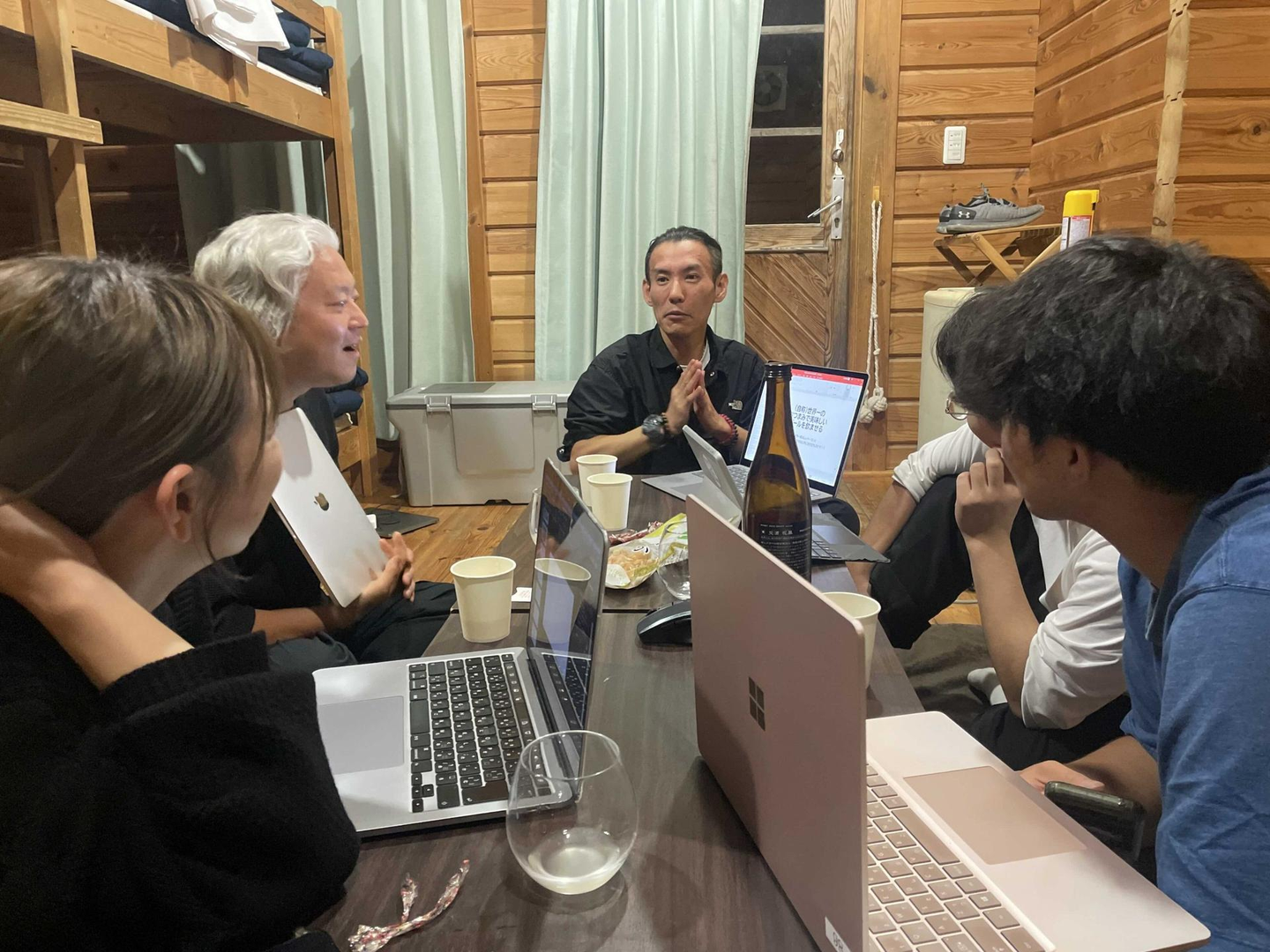 例年の夢会議だと、1日目にプレゼン発表、2日目にレクリエーションが行われるのですが、今回は2日目にプレゼン発表が行われました。なので、前日の夜は最後のプランを詰める時間に。温泉道場監査役の伊東さんにアドバイスいただきながらお互いのプレゼンを聞き、内容をブラッシュアップしていきます。4名それぞれプレゼン内容は違いますが、共通でぶち当たる壁があったり、プレゼン中では聞けなかった熱い思いを語り合ったり、参加者同士で一致団結する様子が印象的でした。最後までやり抜こうという姿勢、かっこいいです。さあ! あとは本番で出し切るのみ!