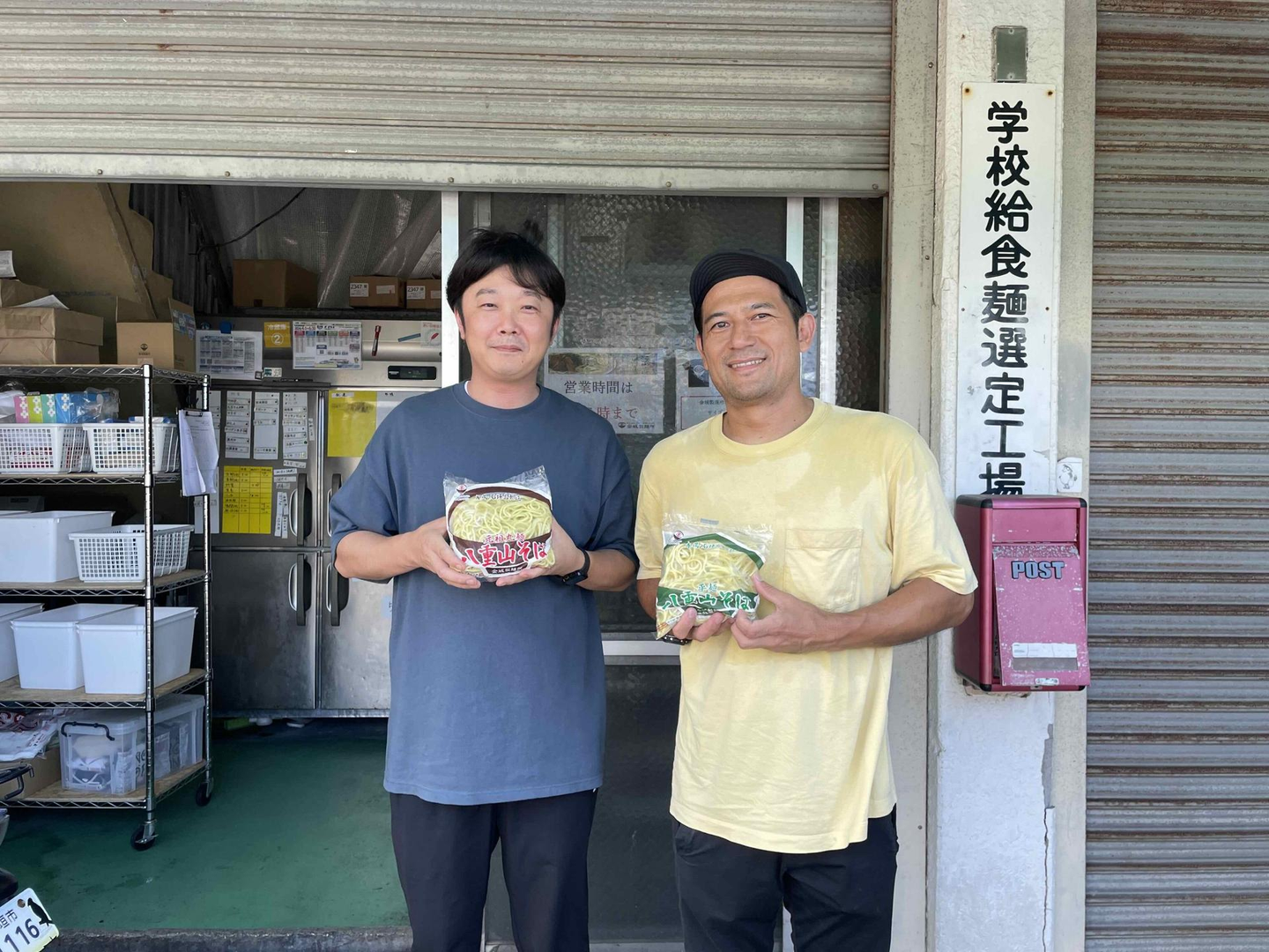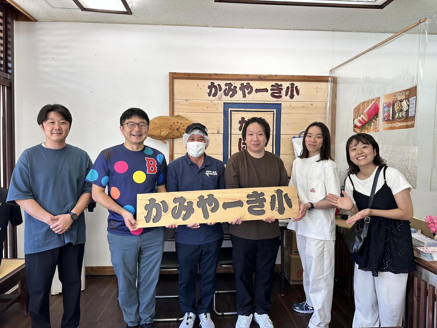 八重山そばの具材には、細切りした牛肉とかまぼこが使われているということで、創業90年の老舗かまぼこ店「かみやーき小(グワー)」も訪問しました。先代から今も変わらない製法で作り続け、八重山地域の特産品として島の多くの人々に親しまれています。店主の方が大の野球ファンだそうで、山﨑さんとのお話も弾みました。