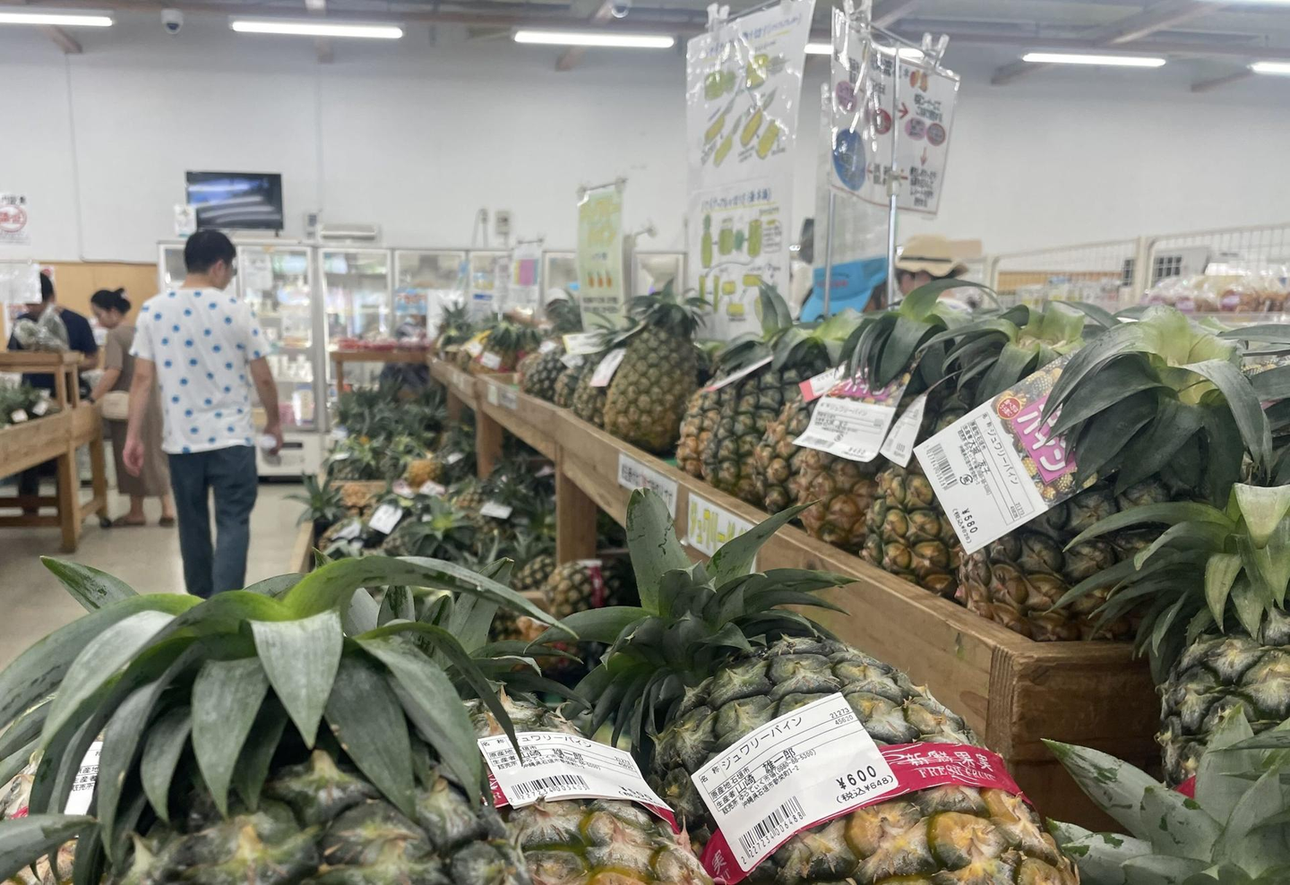 次は石垣島の人気スポット「ゆらてぃく市場」へ。皆さんは見たことがありますか? 入った瞬間香るパイナップルのフルーティーな香り、棚3列全てがパイナップルな農協を。