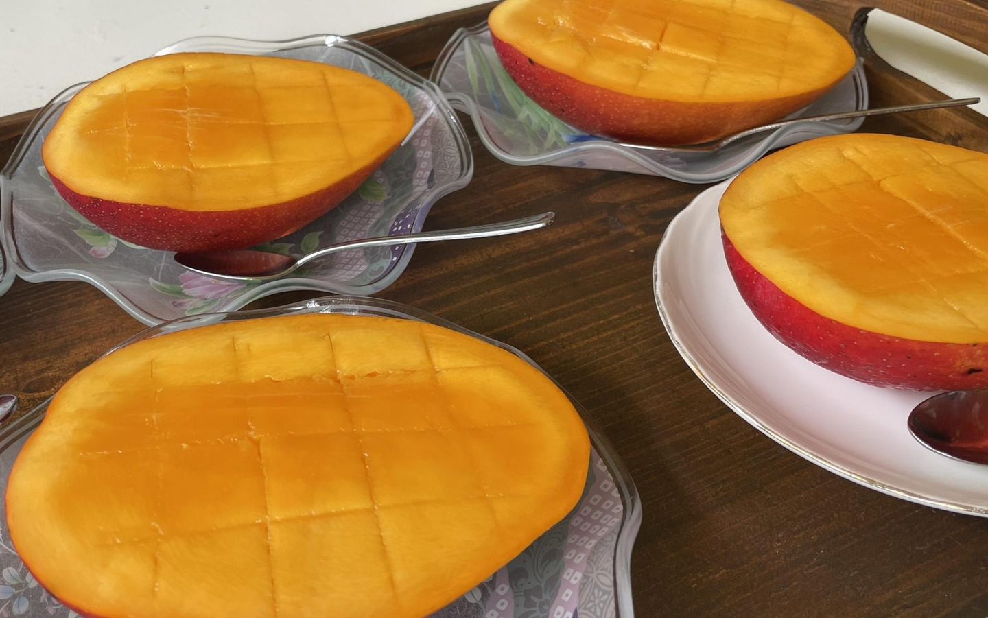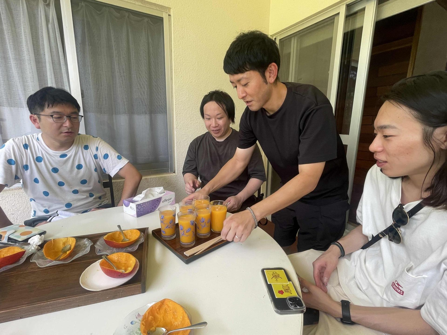 収穫体験の後は、そのままマンゴーを試食させていただきました。朝獲れの生マンゴーと不揃いマンゴーを利活用した生マンゴージュース。