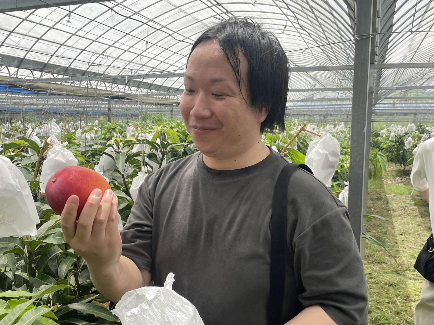 お腹を満たした後は、池原さんの高校の同級生が経営されているマンゴー農家「かわみつ農園」さんへ。参加メンバーは全員初めてのマンゴー収穫体験。かわみつ農園さんでは、独自の製法で「ポトリ果マンゴー」というマンゴーを生産しています。マンゴーの実に袋をかけて樹上で完熟させて、ぽとりと落下したものを産地直送するため、一般市場には出回らない極上品。同じ木にいくつかの実がなりますが、その中でも良いものを厳選し、1つのマンゴーに他の実の栄養素を凝縮させるので、甘さたっぷりのマンゴーができるのです。そんな思いを聞きながら貴重なマンゴーを収穫! 薄田料理長もとっても嬉しそう。