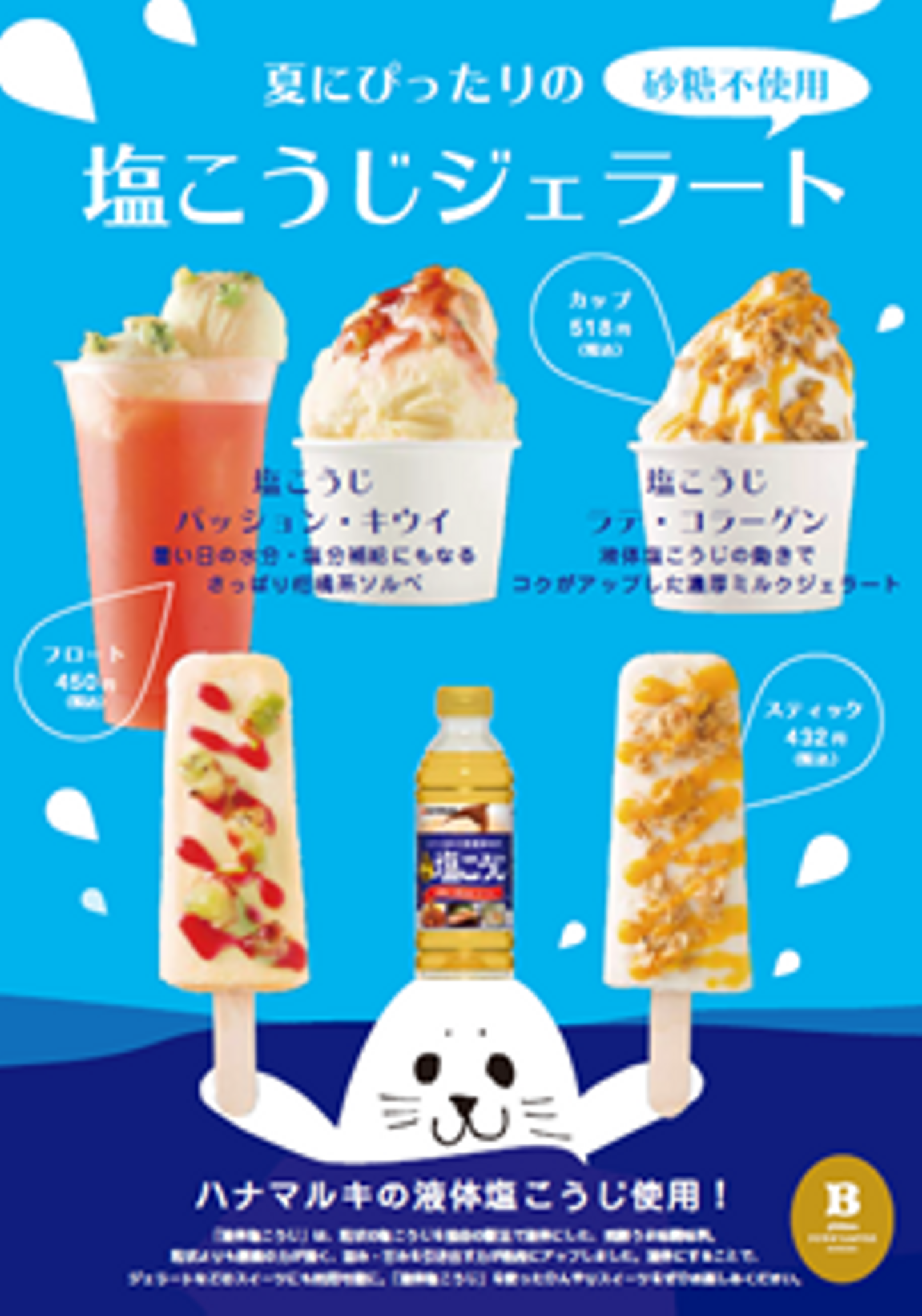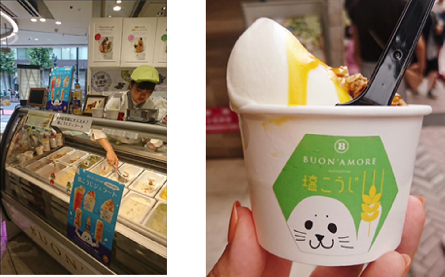 具体的な内容としては、「ブオン・アモーレ」という都内を中心に展開する砂糖不使用ジェラート専門店とコラボして、「液体塩こうじ」を使ったオリジナルのジェラートを開発、期間限定で販売し、
