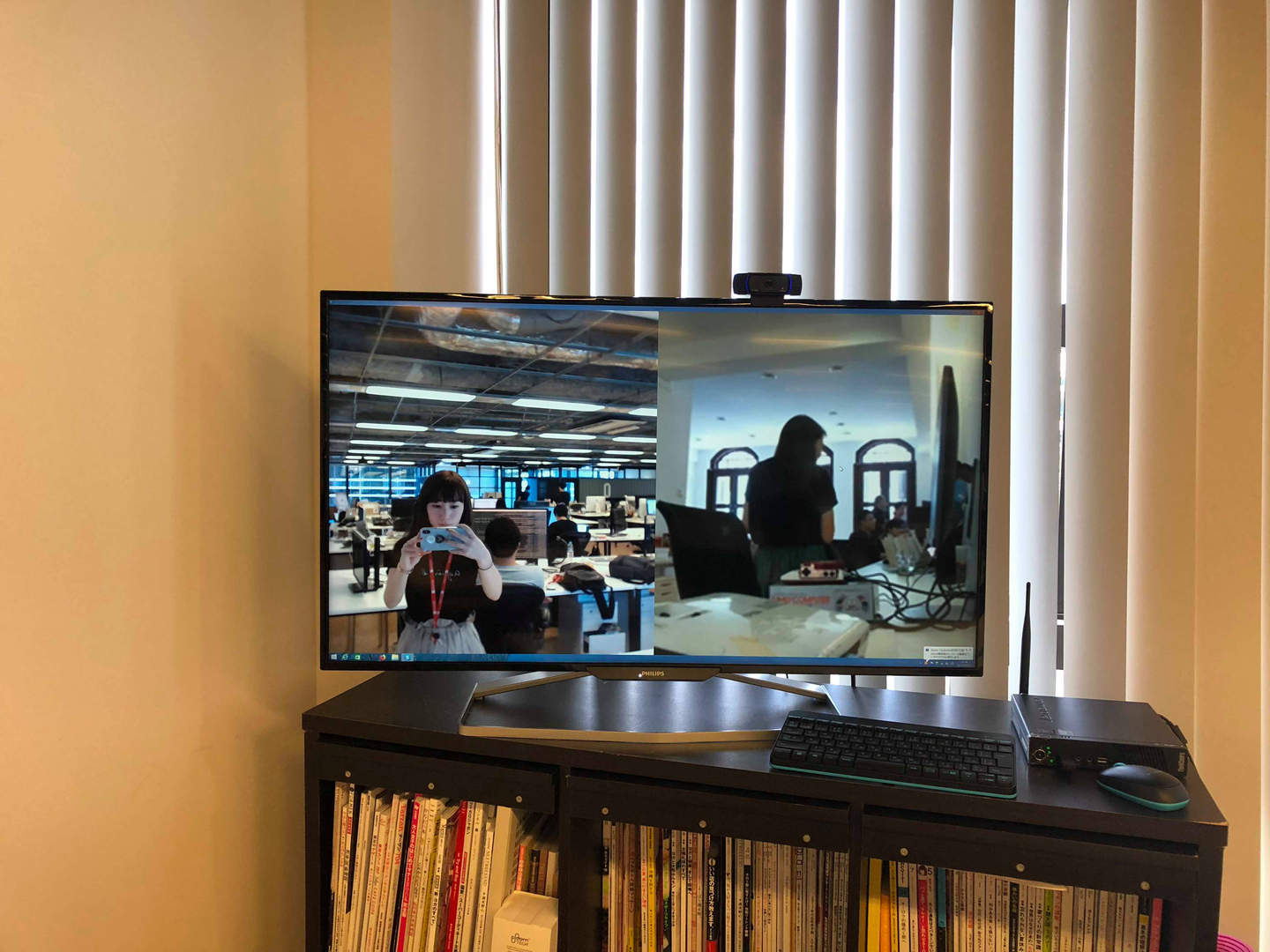 オフィスの左奥にあるこちらの画面はシンガポールのオフィスにskypeで繋がっています。
