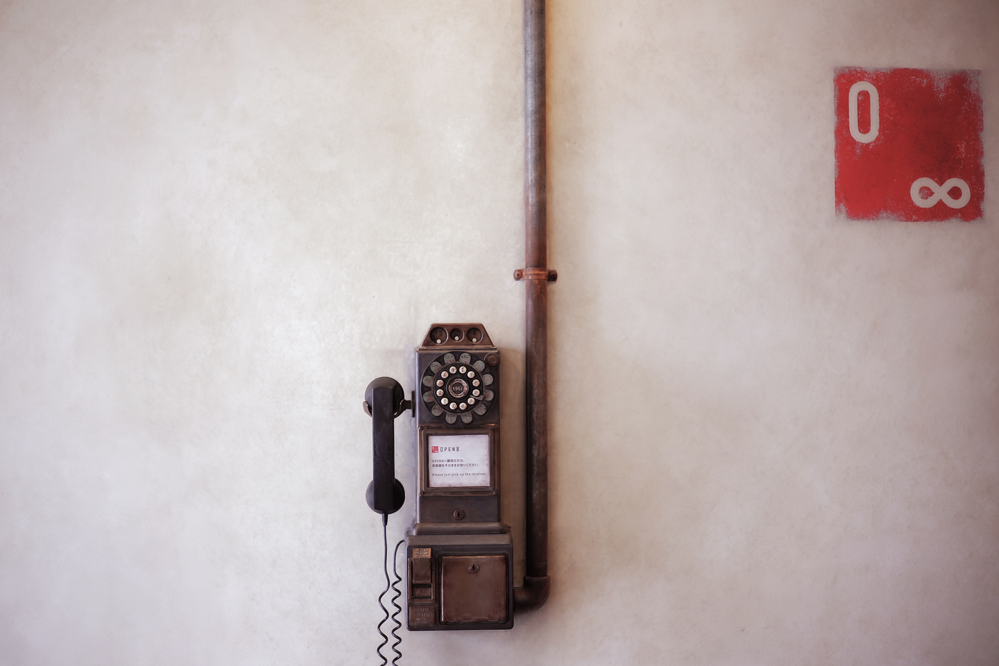 O8のロゴとこちらの電話がお出迎え。受話器をあげるとオフィスに繋がります。