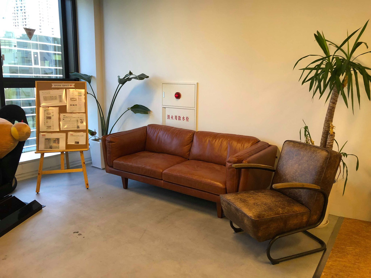 ソファーの隣にはOPEN8TOPICSと書かれた掲示板が置いてあり、