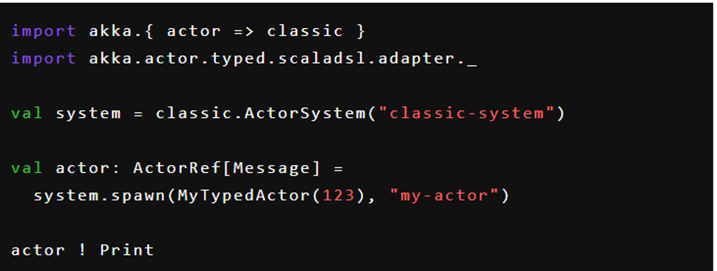 akka.actor.typed.scaladsl.adapter._ というアダプターを import すると ActorSystem から spawn メソッドで Typed Actor が生成できるようになります。生成した Actor はそのまま普通に Typed Actor として使用できます。